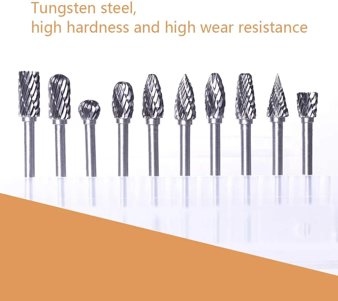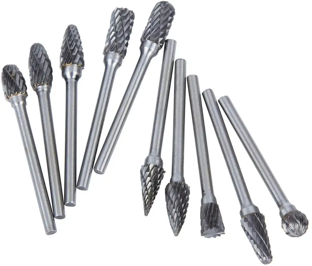 Подходит для большинства инструментов: 10 шт., набор из твердосплавных вращающихся заусенцев с двойным вырезанием, набор из карбида заусенцев, подходит для большинства небольших вращающихся инструментов, гравировки для деревообработки, сделать DIY резные вентиляторы намного проще, чтобы сделать деревянную работу.