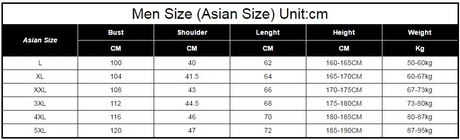 Мужской размер (Азиатский размер) Единица измерения: см Азиатский размер Бюст Плечо Длина Высота Вес См См См См Кг L 100 40 62 160-165 см 50-60 кг XL 104 41,5 64 165-170 см 60-67 кг XXL 108 43 66 170-175 см 67-73 кг 3XL 112 44,5 68 175-180 см 73-80 кг 4XL 116 46 70 180-185 см 80-87 кг 5XL 120 47 72 185-190 см 87-95 кг