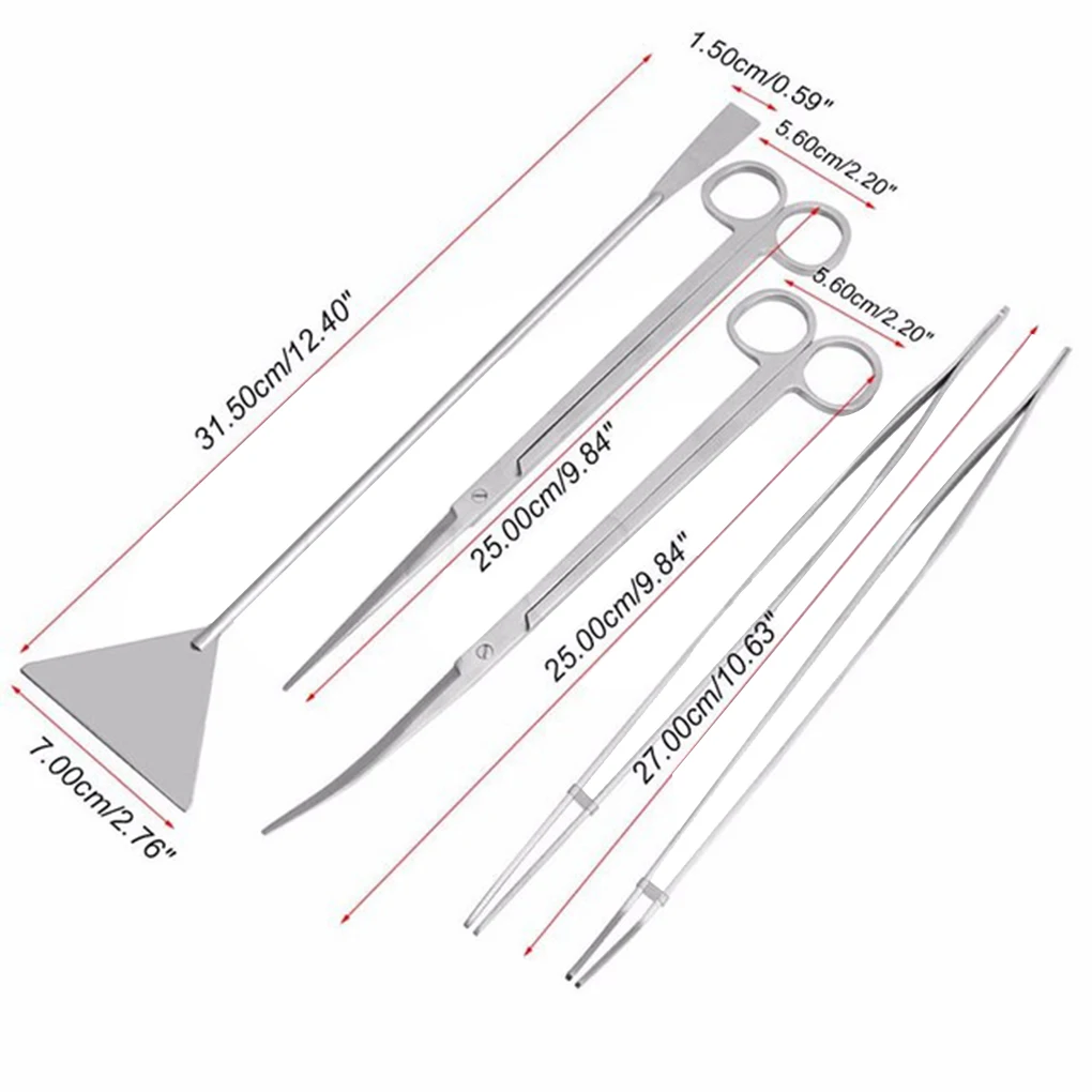 Характеристики:Материал: нержавеющая сталь.Цвет: как на фотографии.Прямая длина пинцета: 27 см.Длина изогнутого пинцета: 27 см.Прямые ножницы: 25,50*5,60 см.Изогнутые ножницы: 25,50*5,60 см.Гравия уравнитель: 31,50*7,00 см.