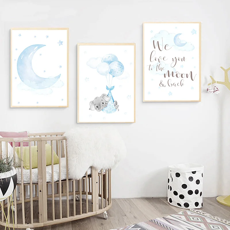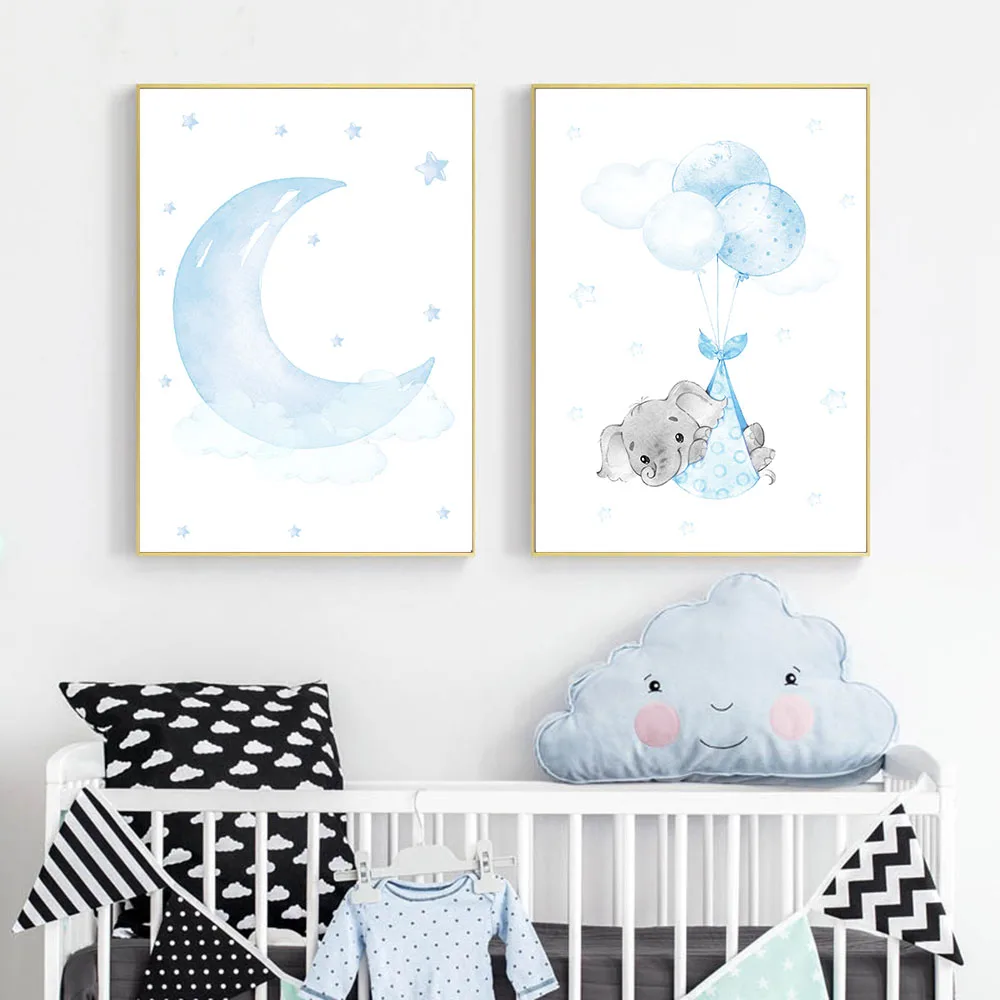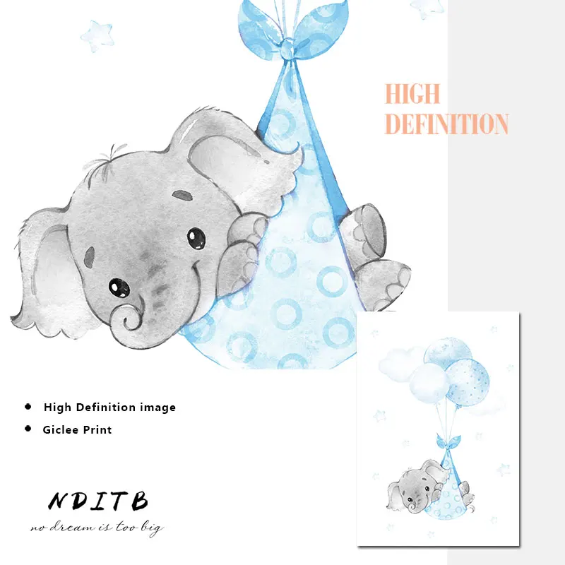 Слон, луна, воздушный шар, холст, плакат для детской стены, искусство, живопись, синий мультфильм, животные, принт, скандинавские дети, картина, декор для детской спальни