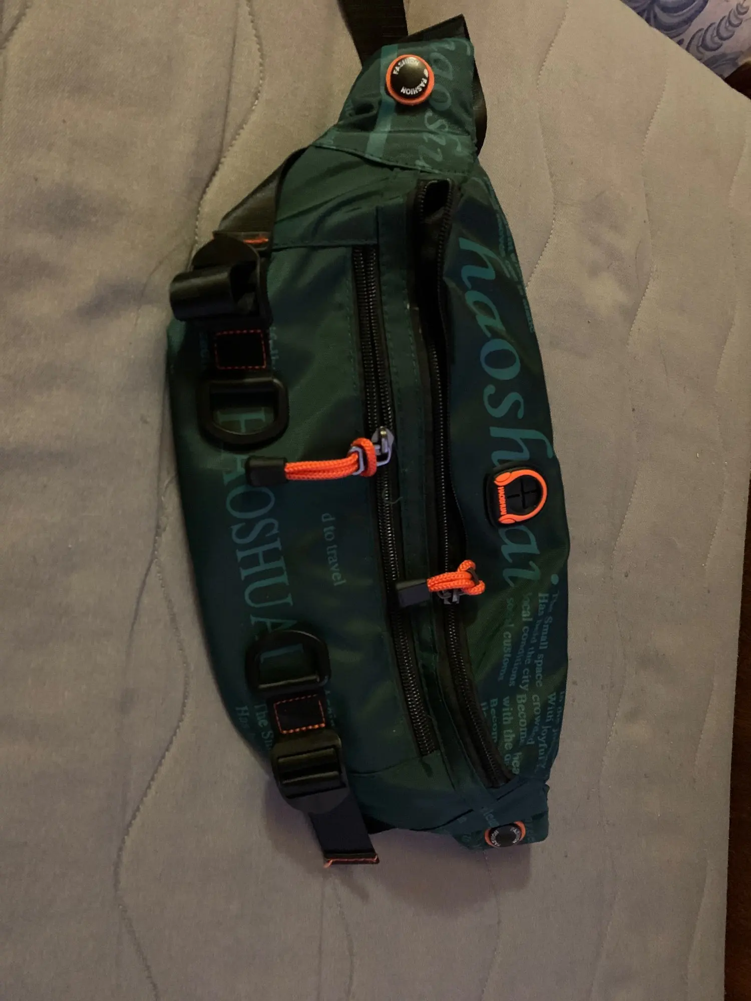 Все качественно, выглядит красиво и аккуратно, гладкая лента ремешка, регулируется от очень короткого до огромного состояния. 4 кармана, один из которых внутренний, есть маленький карабин внутри, довольна вместитльная, на деле чуть больше, чем казалась на фото. Рисунок отлично напечатан, нитки её торчат, есть бирка.