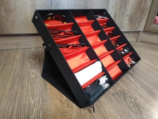 Доставили довольно быстро. Коробка ожидаемо огромная. Смотрится эффектно в витринном положении. Кнопки качественные, держат хорошо. Ткань на коробке напоминает материал для зонтов, а внутрянняя обтвка — атлам). О недостатках: крышка слегка деформировалась (видимо при транспортировке) и на ней заметно проступают «рёбра»; дно прикреплено с дефектами (кое-где виден клей, углы не до конца проклеены); сильно широкое очки (например для 3д-фильмов) помещаются только по диагонали ячейки и то впритирку. Вцелом, покупкой довольна, свой функционал выполняет, но цена завышена, на мой взгляд.