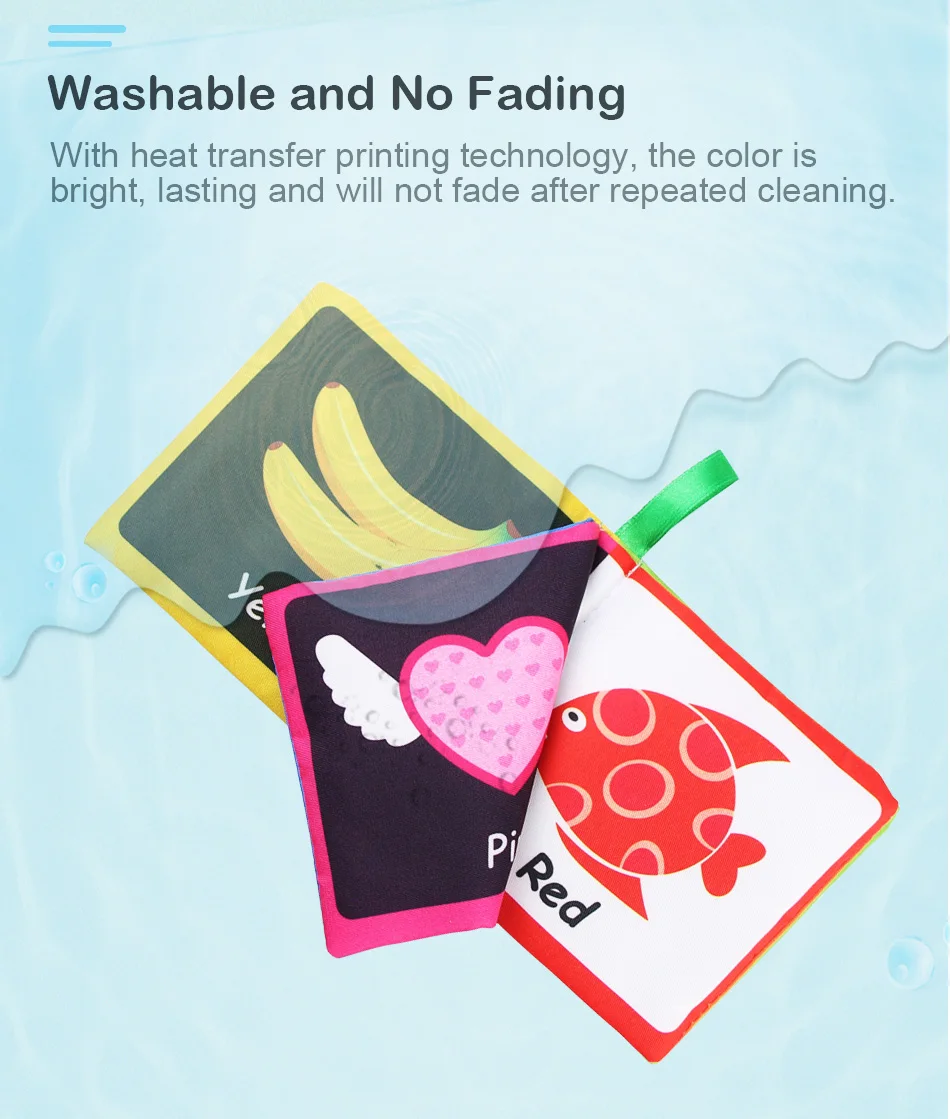 -Изготовлен из мягкой ткани, более безопасный для детей.-С технологией термопечати, цвет стойкий и не выцветает после очистки.-Можно стирать вручную, если книга грязная.-Не люминесцентный и нетоксичный, он безвреден для детей.-Прочное шитье иглой, оно прочное и не легко деформируется.-Яркий и милый узор, он может привлечь внимание ребенка.-Подходящий размер, удобно держать в маленьких руках ребенка.-Встроенный дизайн звуковой бумаги, он может сделать звук «шуршания», более привлекательным для детей.