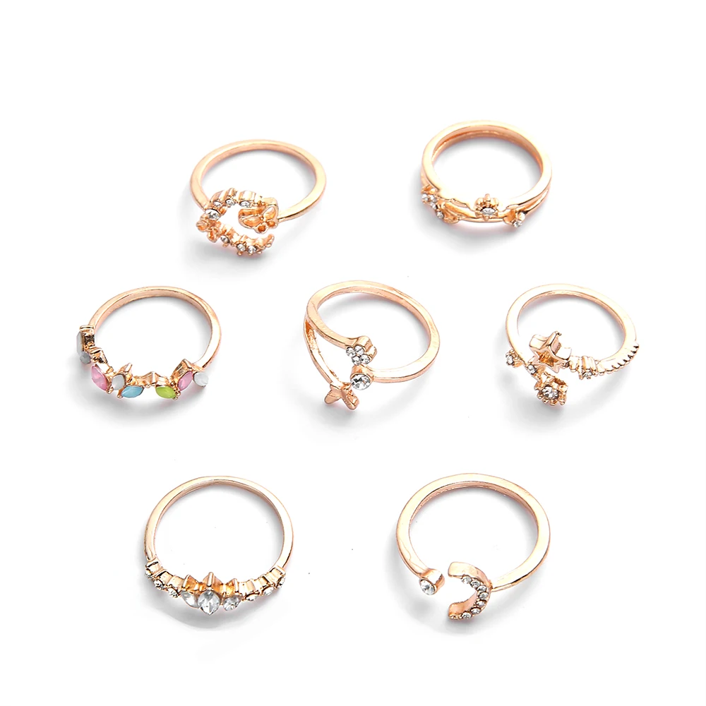 Набор колец для женщин в богемном стиле, винтажный комплект ювелирных украшений на палец, с декором луна, звезды, кристаллы, бабочка, цветок, миди 2020, 7 шт.компл.