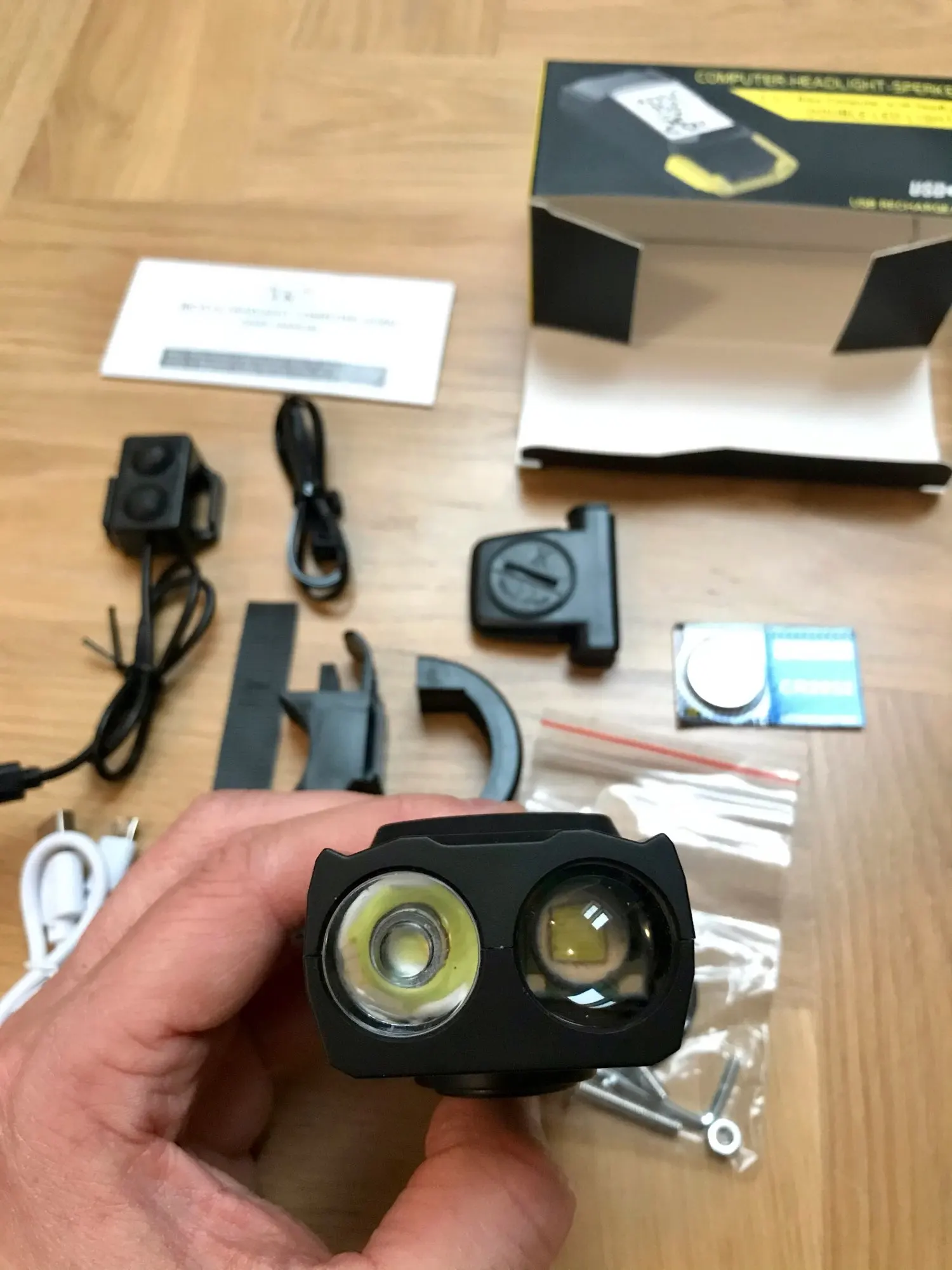 Товор вполне соответствует описанию. Корпус на ощупь прочный, добротный, без люфтов. На велосипед ещё не установил, но включал. Аккумулятор был заряжен. Светит ярко, сигнал громкий. Полностью доволен. Я заказывал в комплекте с двойным кремлением на руль и задним фонарём. Своих денег однозначно стоит!