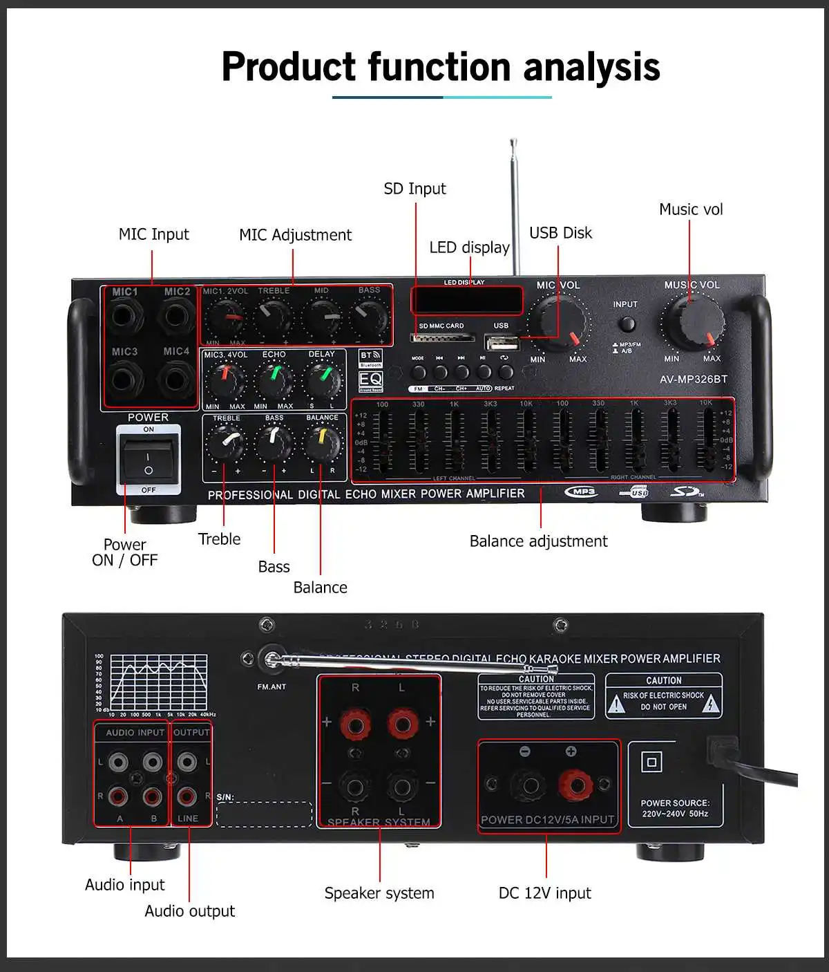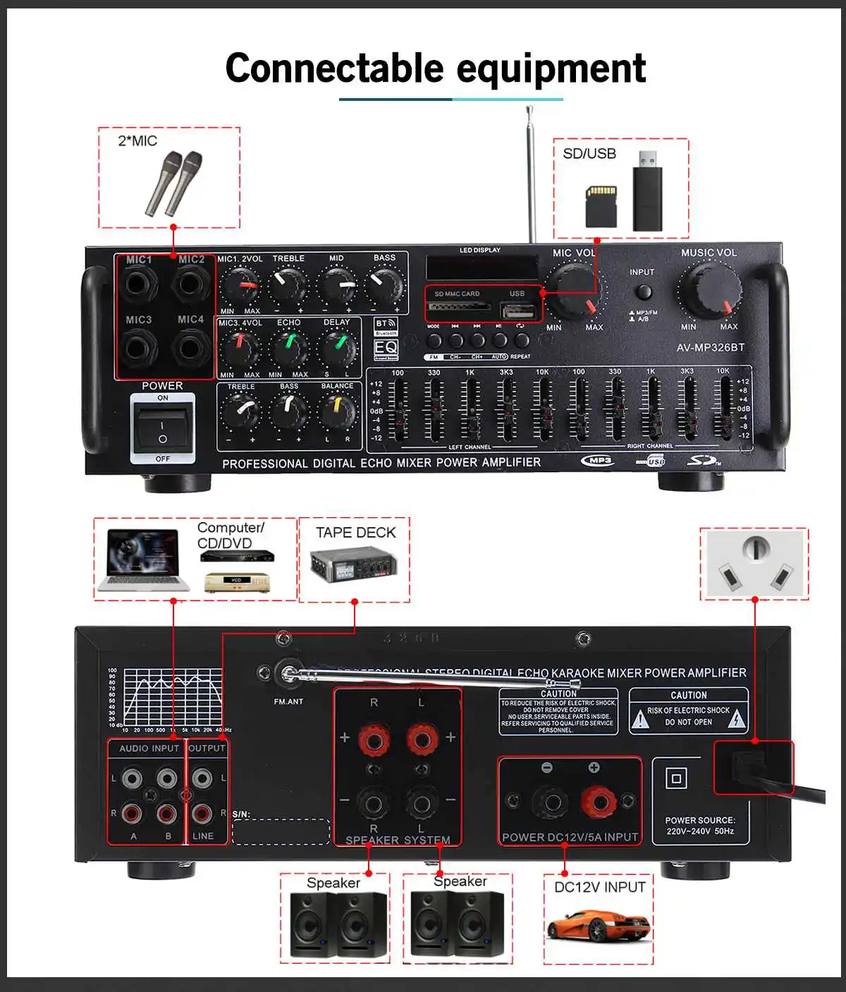 В комплект входит:1 х аудио усилитель мощности1 пульт дистанционного управления Характеристики:Размер: 26*29*10 смНоминальное напряжение: DC 12V 110V-240V 50 / 60HzНоминальная мощность: 1200 ВтПики: 2000 Вт/2200 ВтНоминальная частота: 20KH - 20 кГцОтношение сигнал-шум: 90 дБСтандартное сопротивление: от 4 до 16 ОмТип усилителя мощности: AV усилитель мощностиКанал: 2,0 каналОбщее гармоническое искажение: ≤ 0.5%Чувствительность входного сигнала: 200 мВ (± 30 мВ)Чувствительность на входе микрофона: 9 мВ (± 2 мВ)Выход уровня записи: 1 вВспомогательный уровень выхода: 1 вПоддержка: USB диск/макс. 64 Гб sd-карта (не входит в комплект)Цвет: черныйТип вилки: AU/EU/US Особенности:-Поддержка 4 способа вход для микрофона-Светодиодный дисплей-2 tack выход с эквалайзером-Реверберация, тонкая настройка, баланс, SD, USB интерфейс. Примечание: USB диск/макс. 64 Гб sd-карты не включены в посылка.