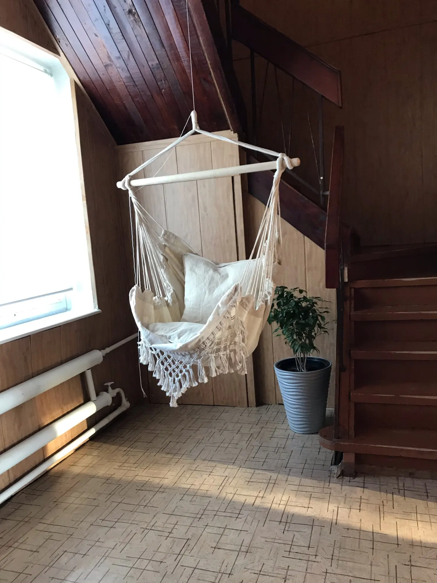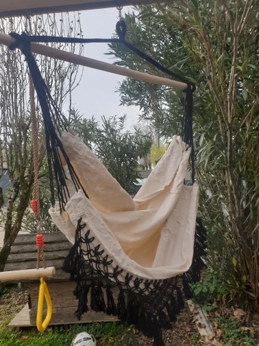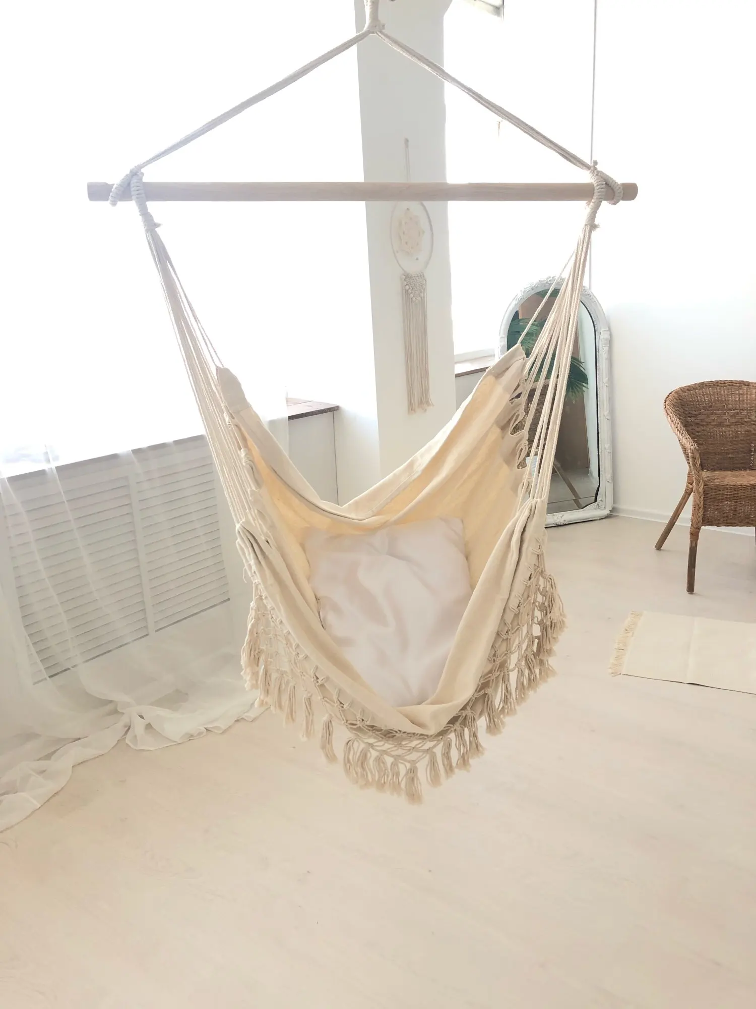 Прекрасные качели-гамак: плотная ткань верёвки. Без подушек, но это не проблема.