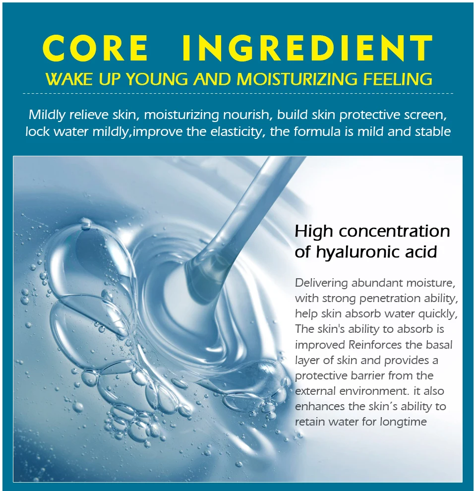 100 мл Гиалуроновая кислота эмульсия увлажняющий лосьонЭта эмульсия-светильник, который легко впитывает. Он очень подходит для использования после использования эссенции лица. Он дышащий и гладкий.ИнгредиентыСостав: небольшая молекулярная вода, глицерин, витамин Е, гиалуронат натрия, АллантоинГиалуроновая кислота (HA)Гиалуроновая кислота (HA) является одним из основных компонентов матрицы эпидермиса и дермы кожи человека. Его физиологическая функция заключается в том, чтобы вода попадала в межклеточное пространство и сочеталась с белком для формирования белкового геля, что означает, что клетки прилипают друг к другу и играют нормальный метаболизм клеток. Для поддержания клеточной воды, защиты клеток от патогенов, ускорения восстановления тканей кожи, улучшения заживления и регенерации РАН, уменьшения рубцов, повышения иммунитета и т. д. Получены из негмо ферментации, не-животных источников
