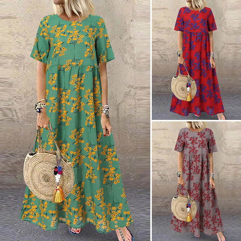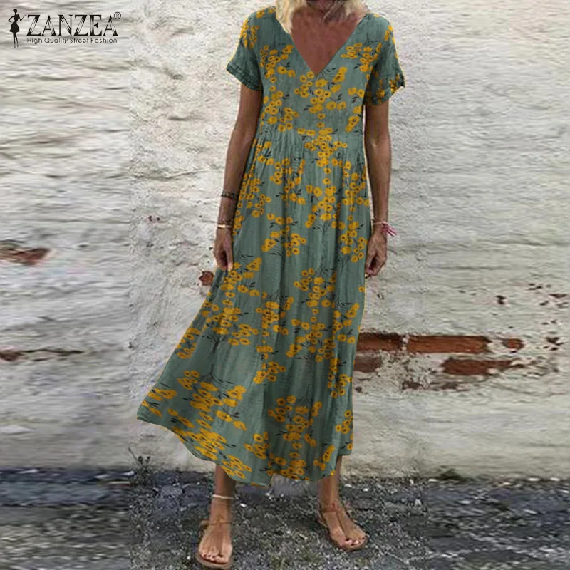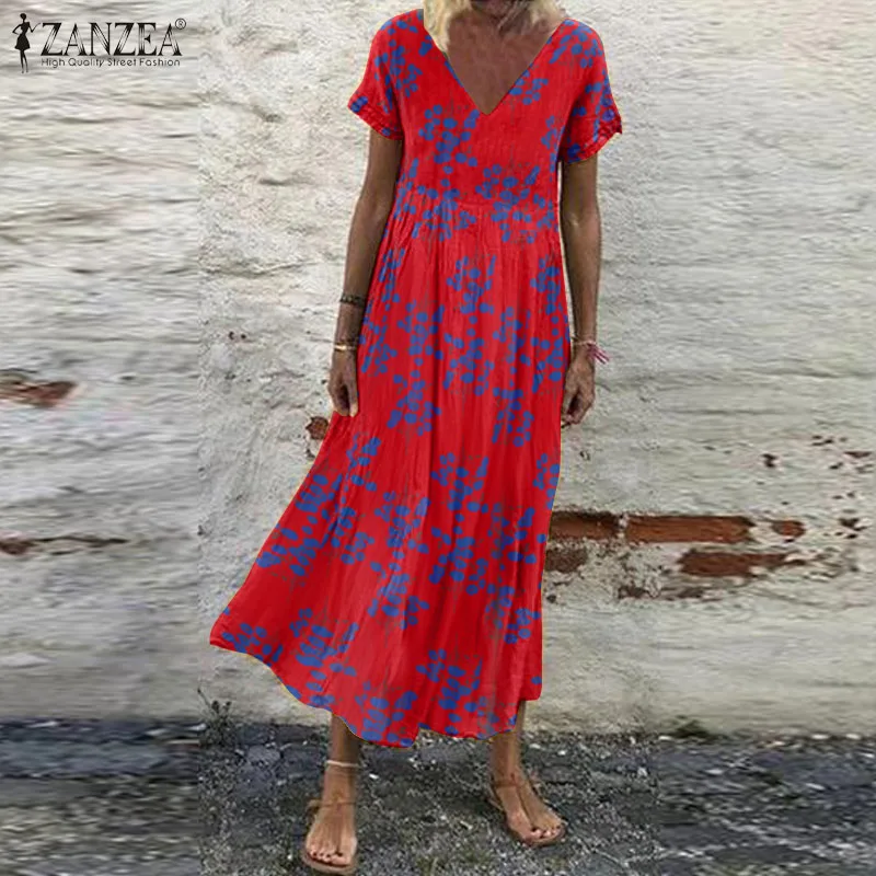 Женский Сарафан Макси ZANZEA, летнее богемное пляжное платье с цветочным принтом, винтажное платье с V-образным вырезом и коротким рукавом, платья большого размера