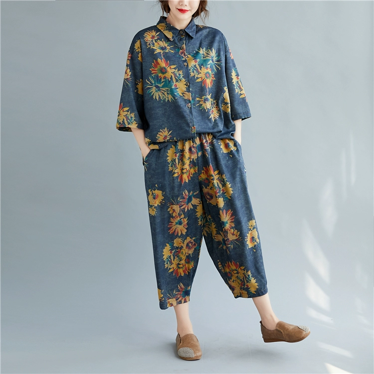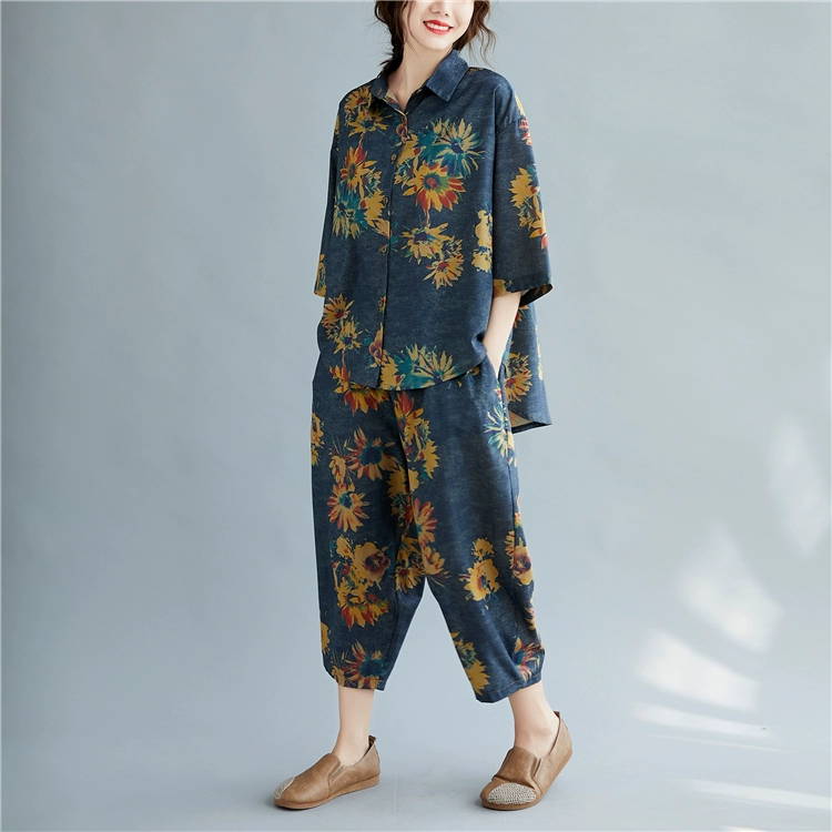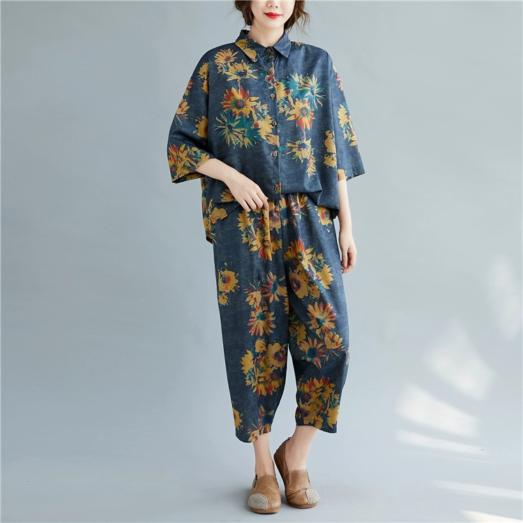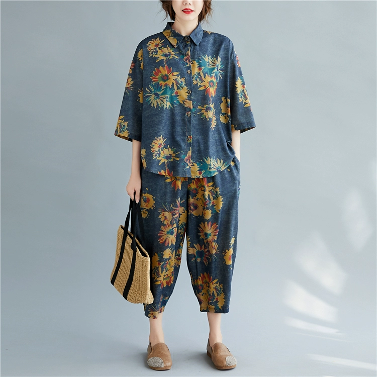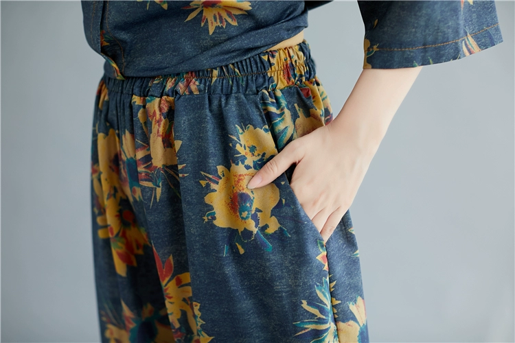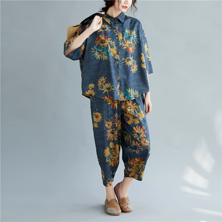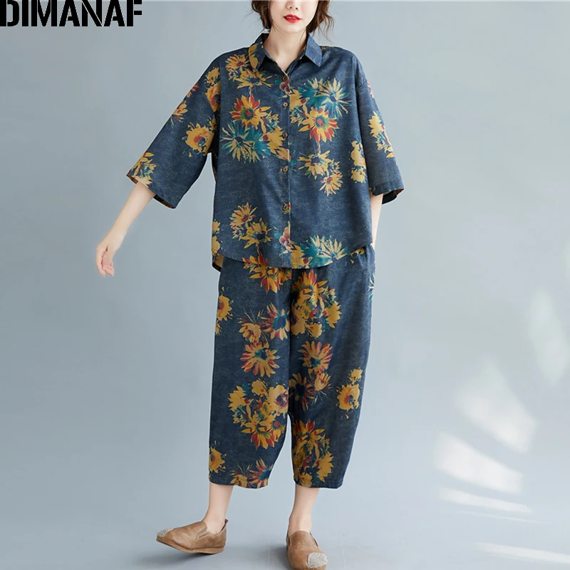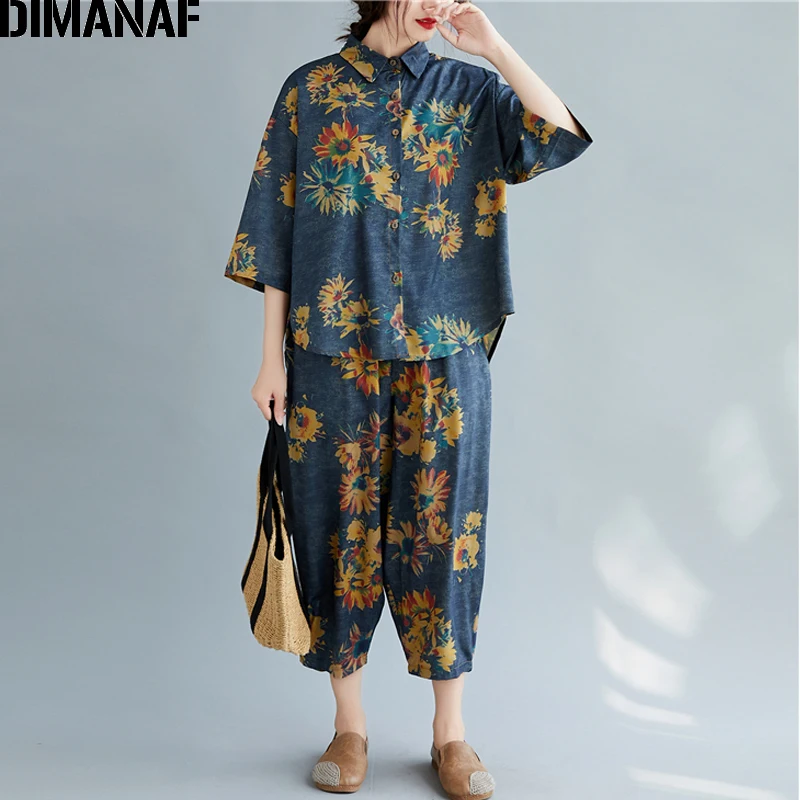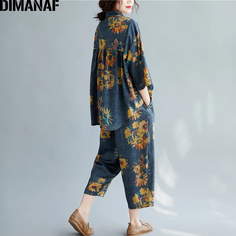 Женский костюм с цветочным принтом DIMANAF, винтажный топ из хлопка и льна на пуговицах, свободные длинные штаны, осенний комплект