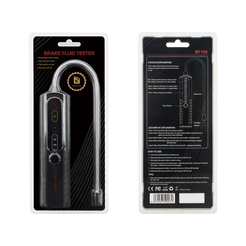 D. Вставьте испытательный щуп в тормозную жидкость (протрите щуп чисто, иначе он удалит результаты) Обнаруживает повторное исправление светодиодный ном дисплее.