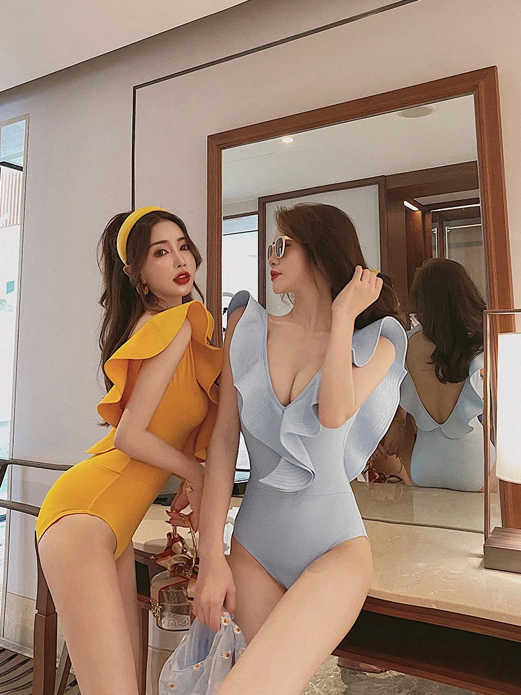 Пикантный слитный купальник с рюшами, Женская однотонная одежда для плавания, Монокини пуш-ап с высоким вырезом, купальный костюм с открытой спиной, трикини, Желтый купальный костюм