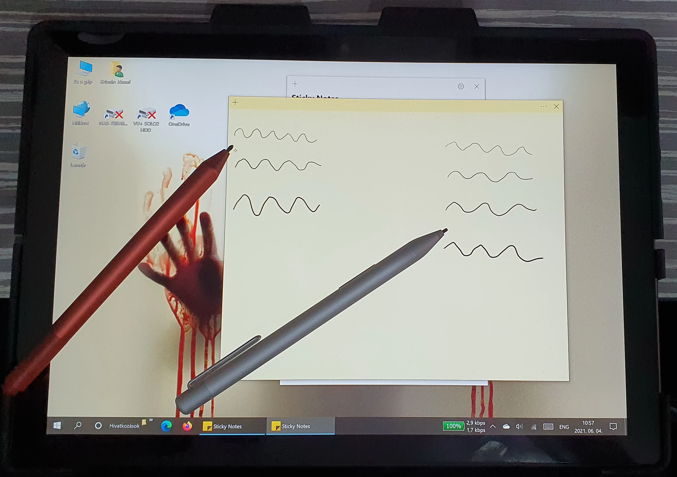 Работает, на силу нажатия реагирует. Функционал не такой как пишут про родной майкрософтоский, стирает не верхней частью, а той которой рисует если нажать кнопку на стилусе. второй кнопкой передвигает. в обычных приложениях кнопки соответствуют мышиным
