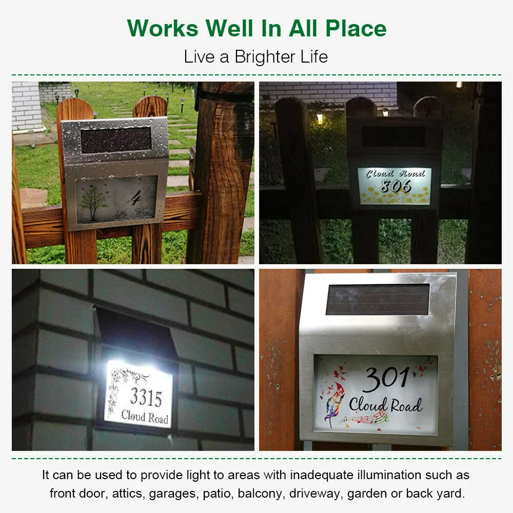 Современный Солнечный свет из нержавеющей стали (класс ip44) светильник в темноте, 5 мм Противоударная прозрачная стеклянная акриловая передняя панель, задняя панель с алюминиевым эффектом, поставляются нержавеющие стойки и крепления, внешний глянцевый черный винил с вашим номером и названием улицы или названием дома, новый Римский шрифт Times.