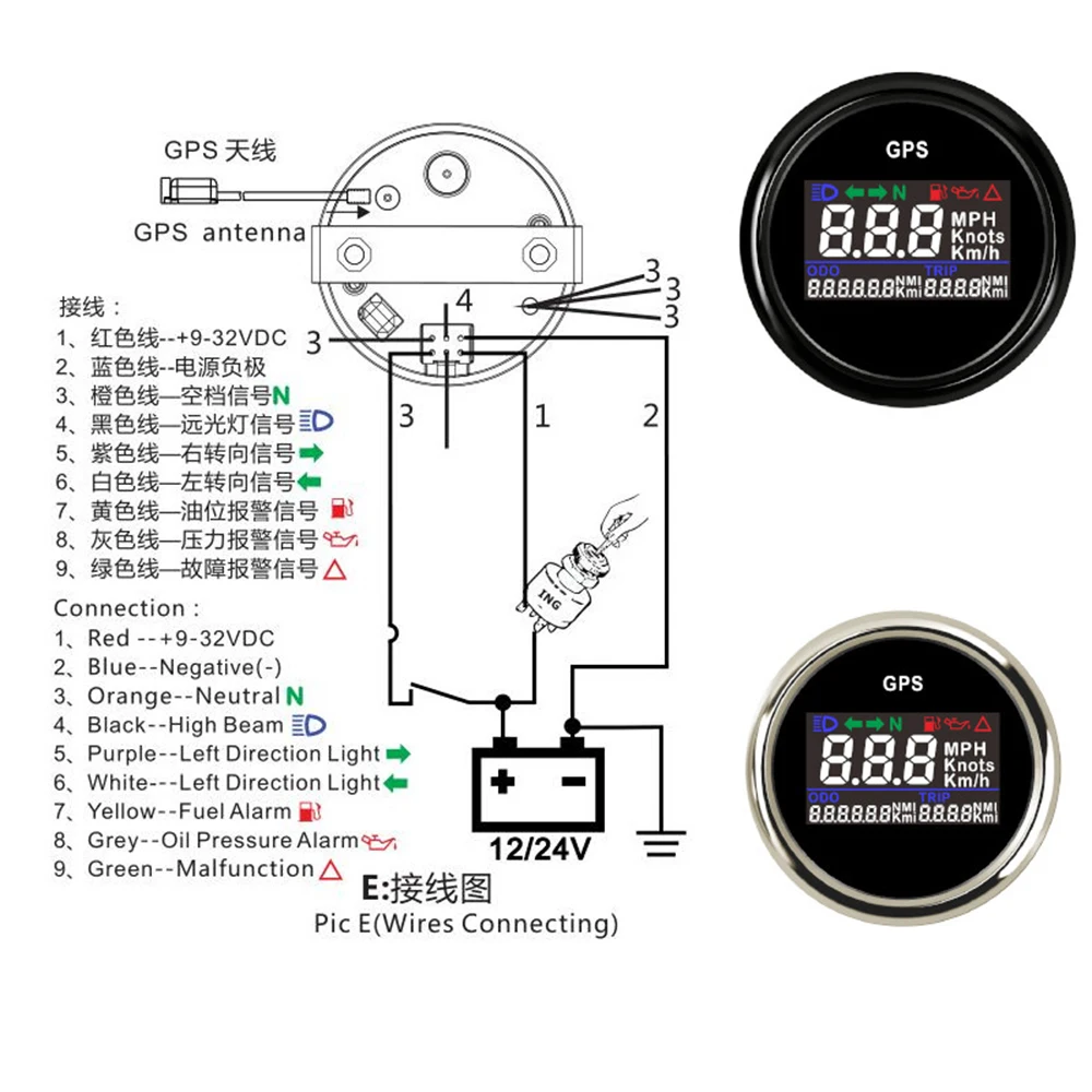 -Фиксирующий Размер: 52 мм (2 ")-Диапазон индикации: 0 ~ 999 (MPH, узлы, км/ч регулируемый)-Переключатель между MPH(Mi), узлами (NMI) и км/ч (км) задней кнопкой-Общая регулировка пробега, диапазон пробега: 0-99999,9 (Mi,NMI,KM в наличии)Туда и обратно счетчик-Рабочее напряжение: 12 В/24 В-Компенсация одометра в слепую область GPS-Сигнал тревоги превышения скорости (регулируемое значение)-Рабочая температура: от-40 до 85 °C-Режим работы: ЖК-дисплей, шаговый двигатель