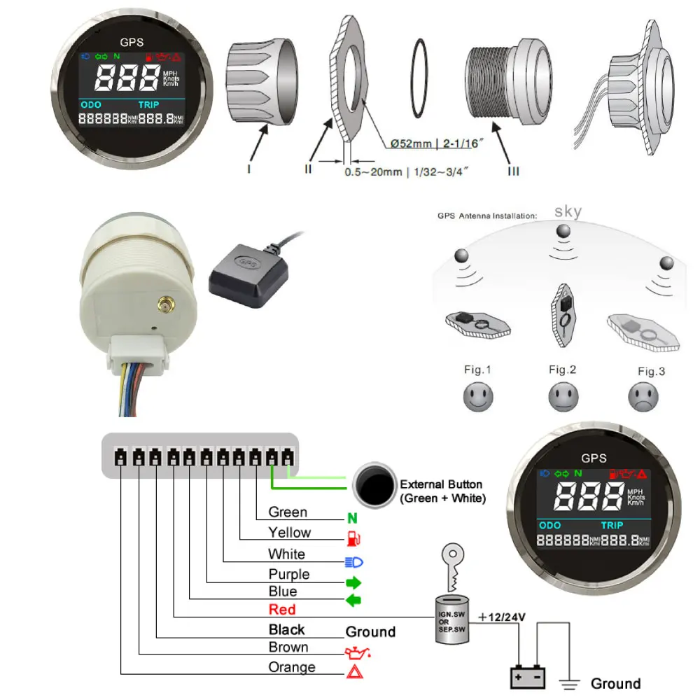 1. Отрежьте отверстие Φ52мм (2-1/16 ") в панели (II) и дайте зазор 55 мм (2 3/16") за панелью, чтобы соответствовать манометру. 2. Снимите Крепежное кольцо (I), вставьте датчик через панель спереди. Затягиватель (III) с помощью крепежного кольца (I) сзади. 3. Подключите кабели согласно схеме/этикетке. 4. Подключите gps-антенну к розетке в задней части манометра и поместите его в хорошее положение, указывающее на небо напрямую. 5. После включения питания позвольте манометру найти спутниковый сигнал в течение 1 минуты. Датчик покажет скорость в узлах/км/ч.