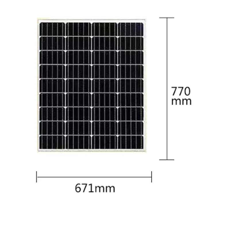 Модуль Pmax :100 Вт Размер и количество ячеек: 125 мм * 125 мм 36 шт/4*9 Допуск: ± 3% Vmp:18 в Имп: 5,55 А ЛОС: 21,6 в Isc :6.11A Макс. Syst.Oper. Напряжение: 1000 в Диодеры: 2 проходных Размеры: 770 мм * 671 мм * 30 мм Вес: 7,8 кг Рабочая температура. Диапазон:-40 градусов t0 80 градусов Относительная влажность: от 0 до 100% Сопротивление: стальной шар 227 г падает с высоты 1 м и скоростью ветра 60 м/с Гарантия: Pm не менее 90% в течение 10 лет и 80% в течение 25 лет