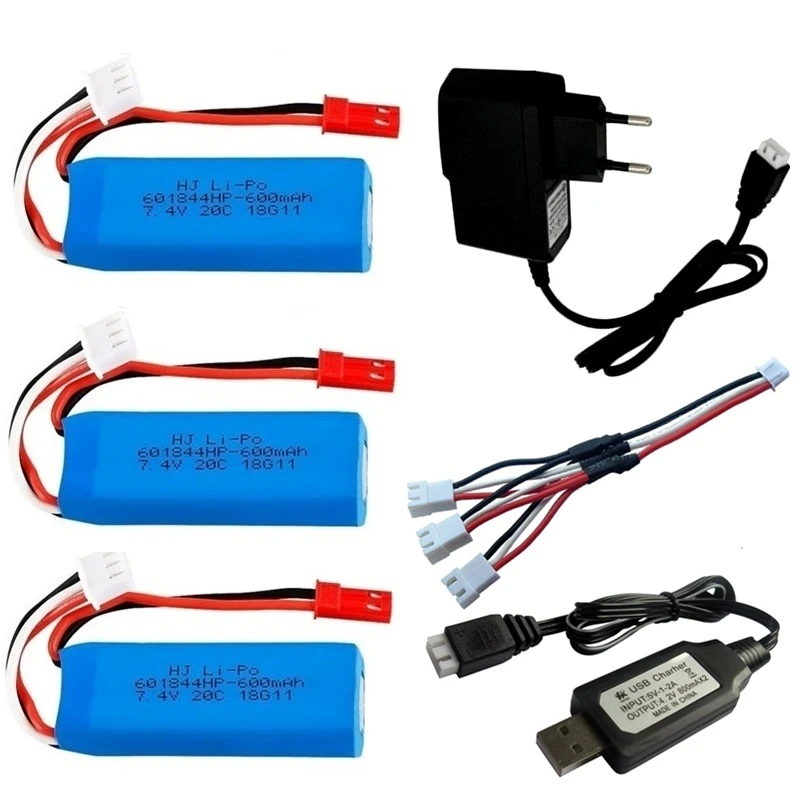 Аккумулятор Lipo 7,4 в 600 мАч, обновленный, для WLtoys K969, K979, K989, K999, P929, P939, детали машинки на радиоуправлении, батарея 7,4 В с зарядным кабелем 3 в 1