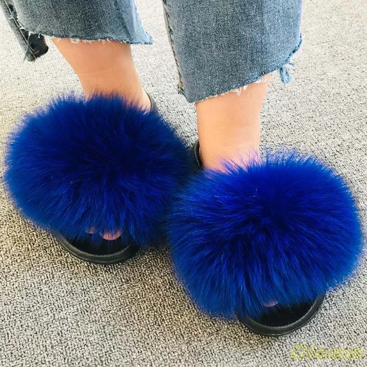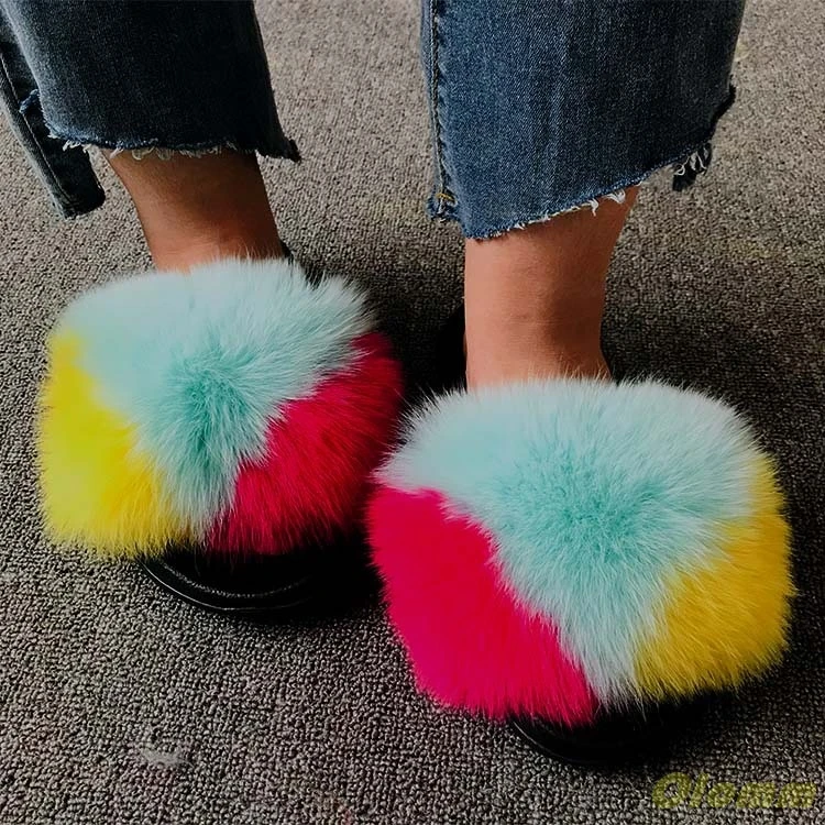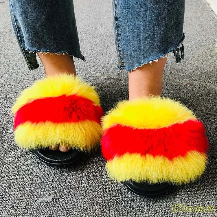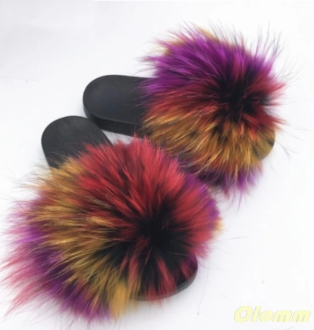 Женские пушистые шлепанцы на осень и весну, пушистые сандалии с мехом енота, дизайнерские пушистые тапочки, шлепанцы с лисьим мехом, сланцы, радужные сандалии