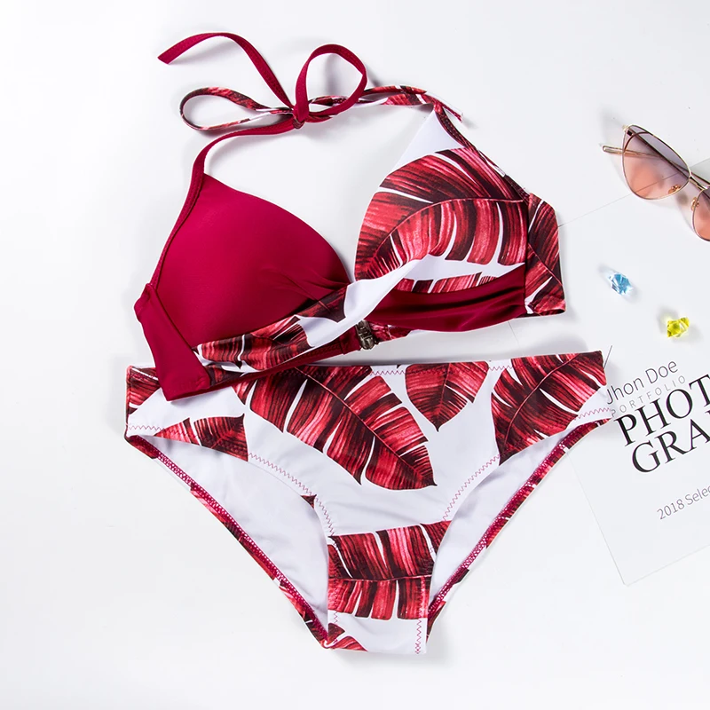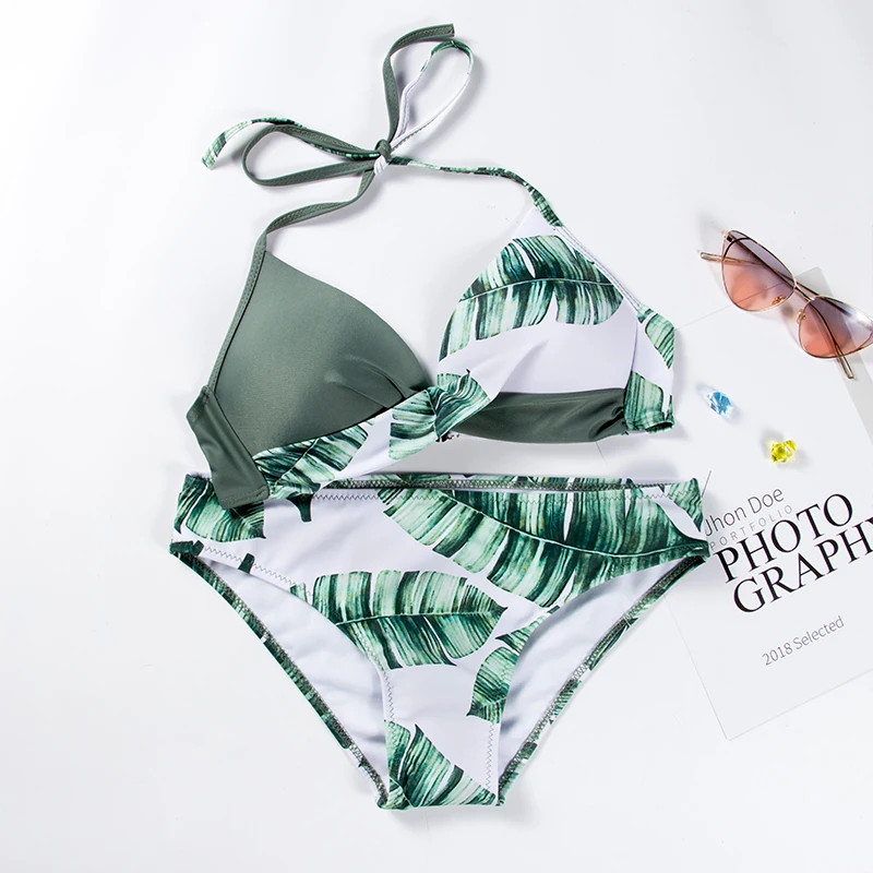 Сексуальный женский купальник, женский купальный костюм, женский купальный костюм с принтом листьев, бикини с лямкой на шее, модная пляжная одежда, бикини