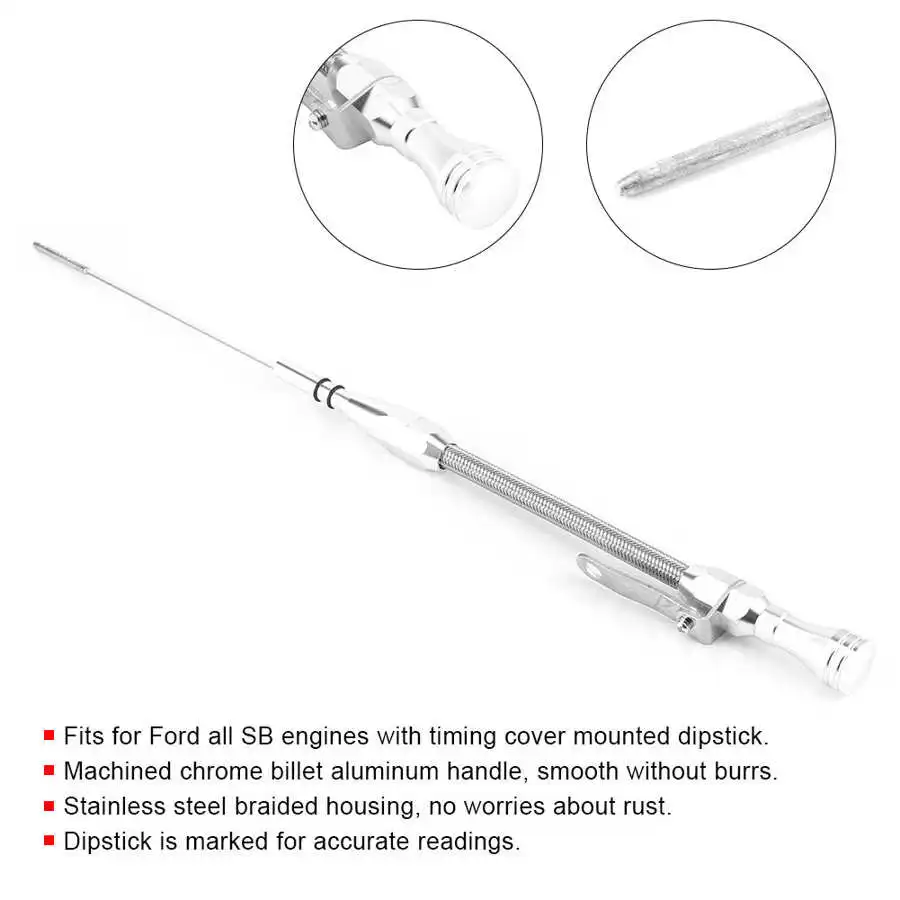 1. Подходит для двигателей Ford all SB с крышкой ГРМ, установленным щупом (ранний стиль). 2. Щуп отличного качества, отлично смотрится внутри любого моторного отсека. 3. Алюминиевая ручка из хромированной заготовки, гладкая, без заусенцев, приятная на ощупь. 4. Плетеный корпус из нержавеющей стали, не беспокоится о ржавчине, долговечность. 5. Щуп отмечен для точных показаний, прост в эксплуатации, удобен в использовании. 6. Простая установка, легкая установка в любом месте (чаще всего крепится на болты коллектора или выпускного коллектора).