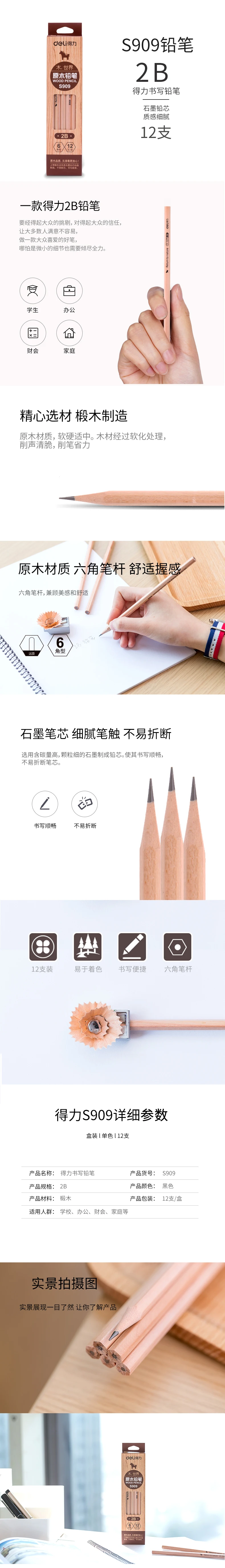 12 шт.кор. Deli S909, деревянный гексагональный высококлассный графитовый нетоксичный карандаш 2B, ручка для письма, студенческие офисные канцелярские принадлежности