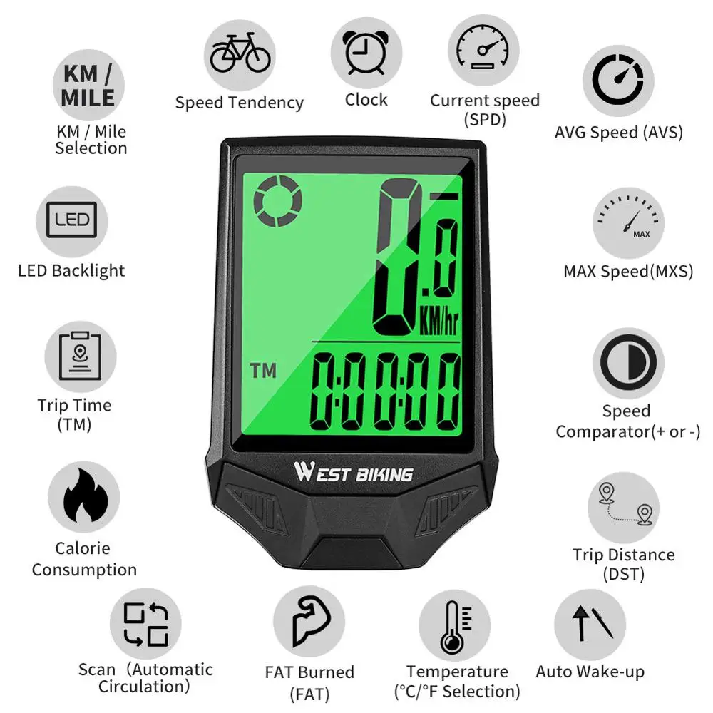 WEST BIKING водонепроницаемый велосипедный компьютер, беспроводной Велосипедный МТВ, одометр, Спидометр с подсветкой, велосипедный секундомер