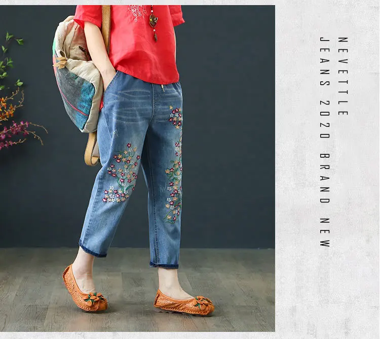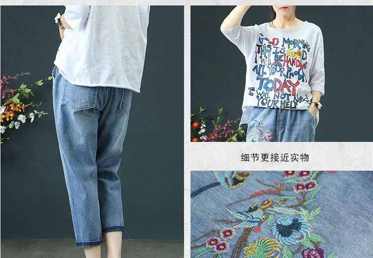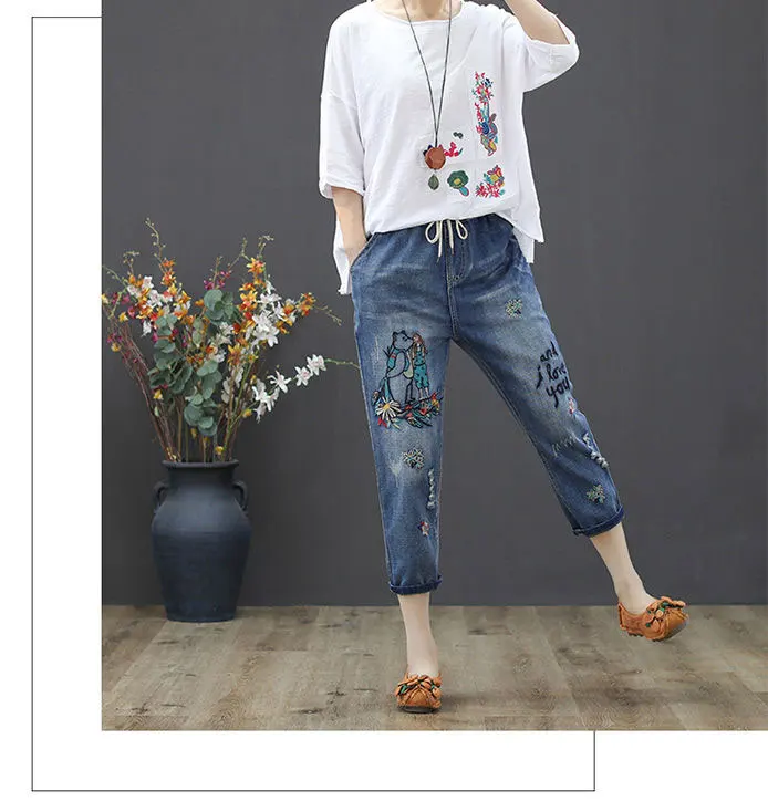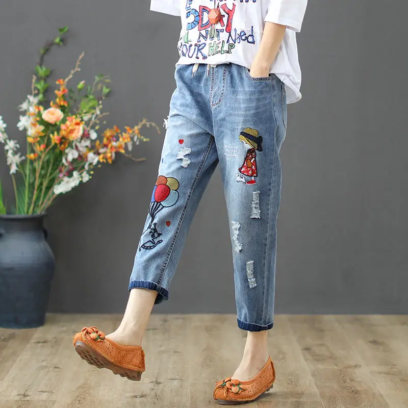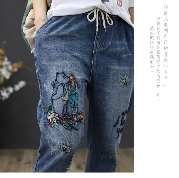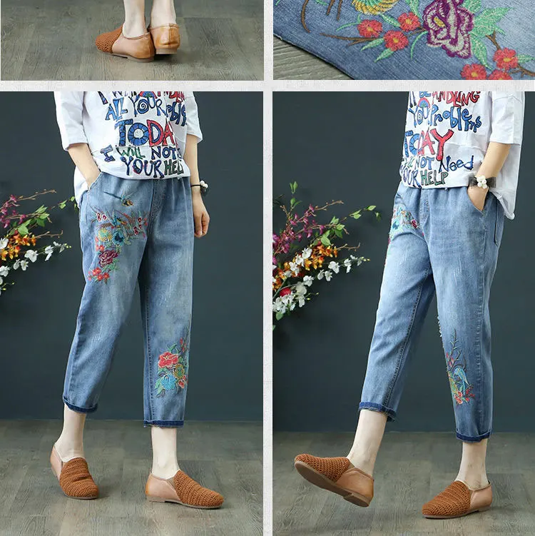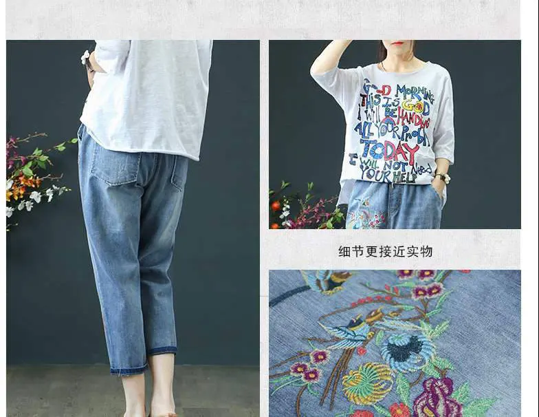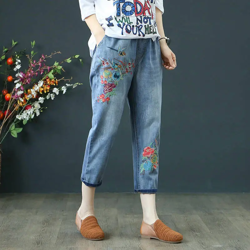 Женские джинсы с высокой талией, свободные шаровары до щиколотки, с эластичной резинкой на талии, с вышивкой, размера плюс
