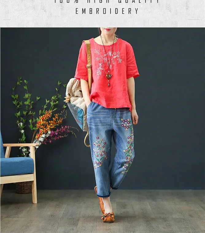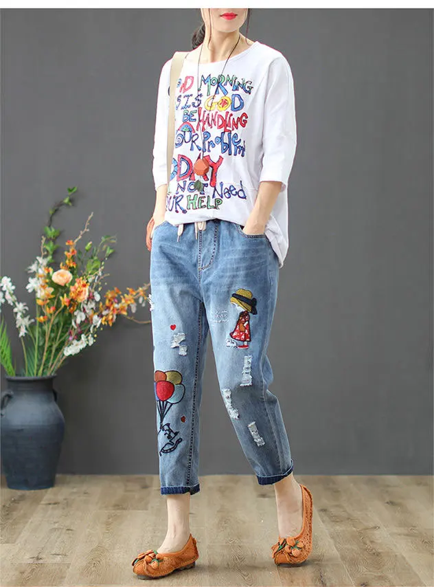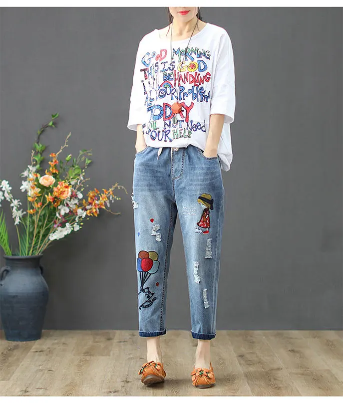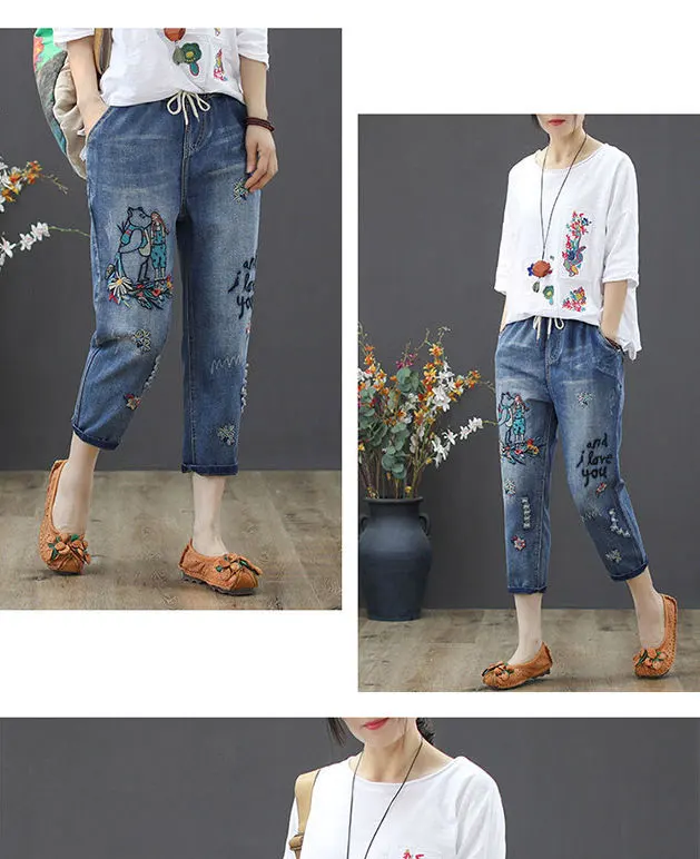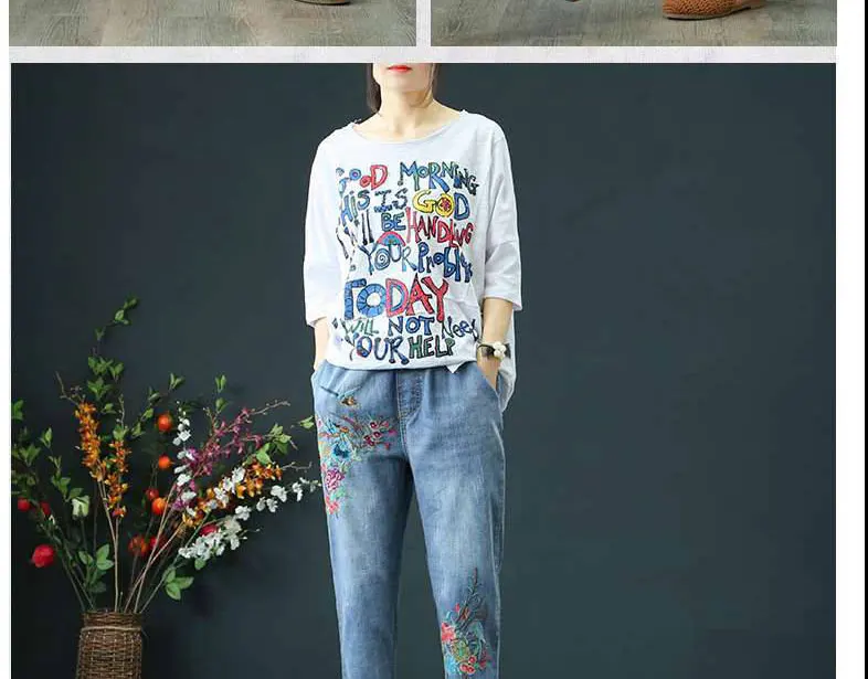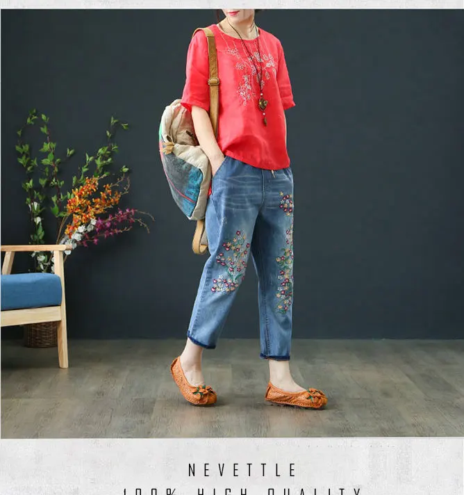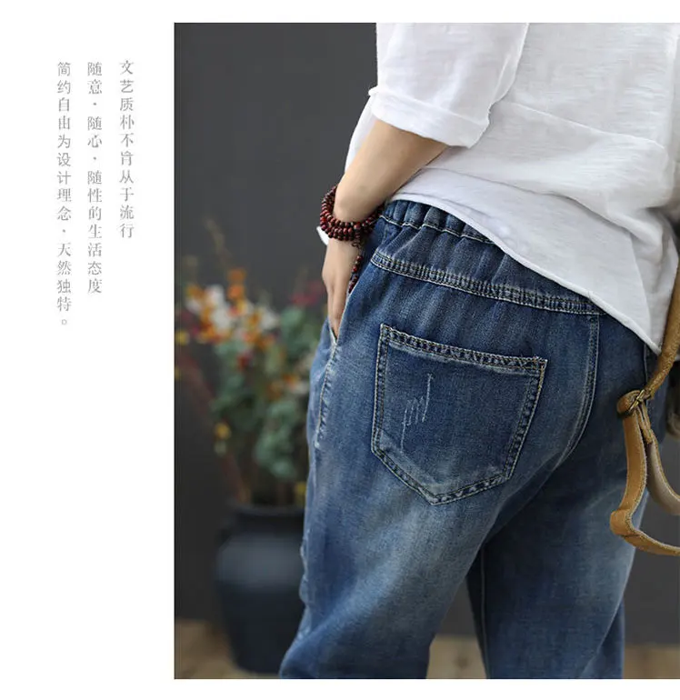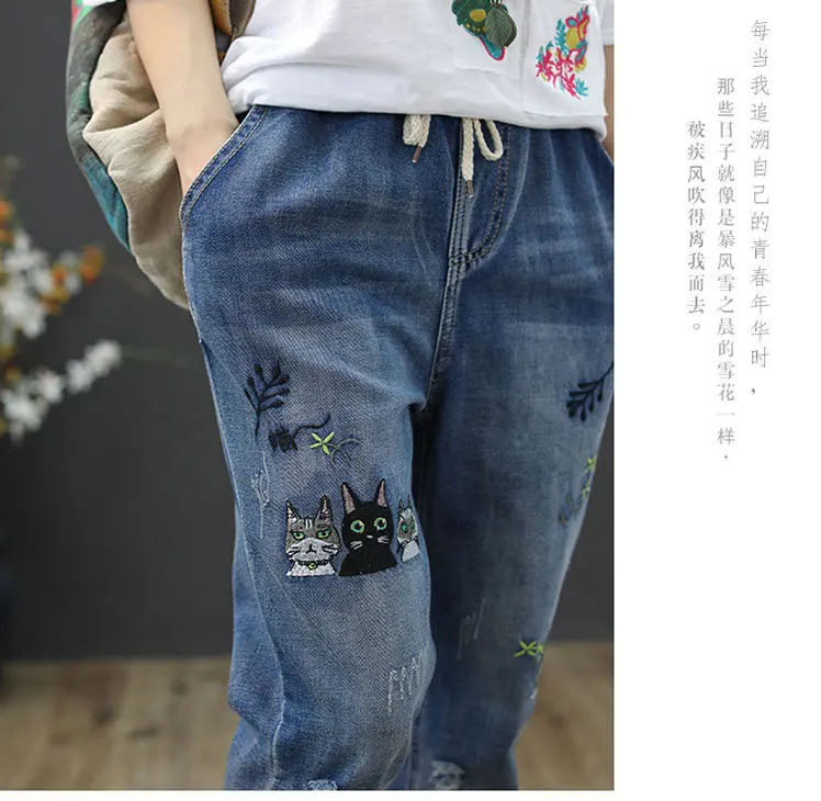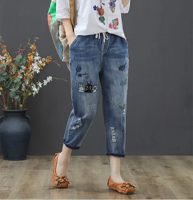 Женские джинсы с высокой талией, свободные шаровары до щиколотки, с эластичной резинкой на талии, с вышивкой, размера плюс
