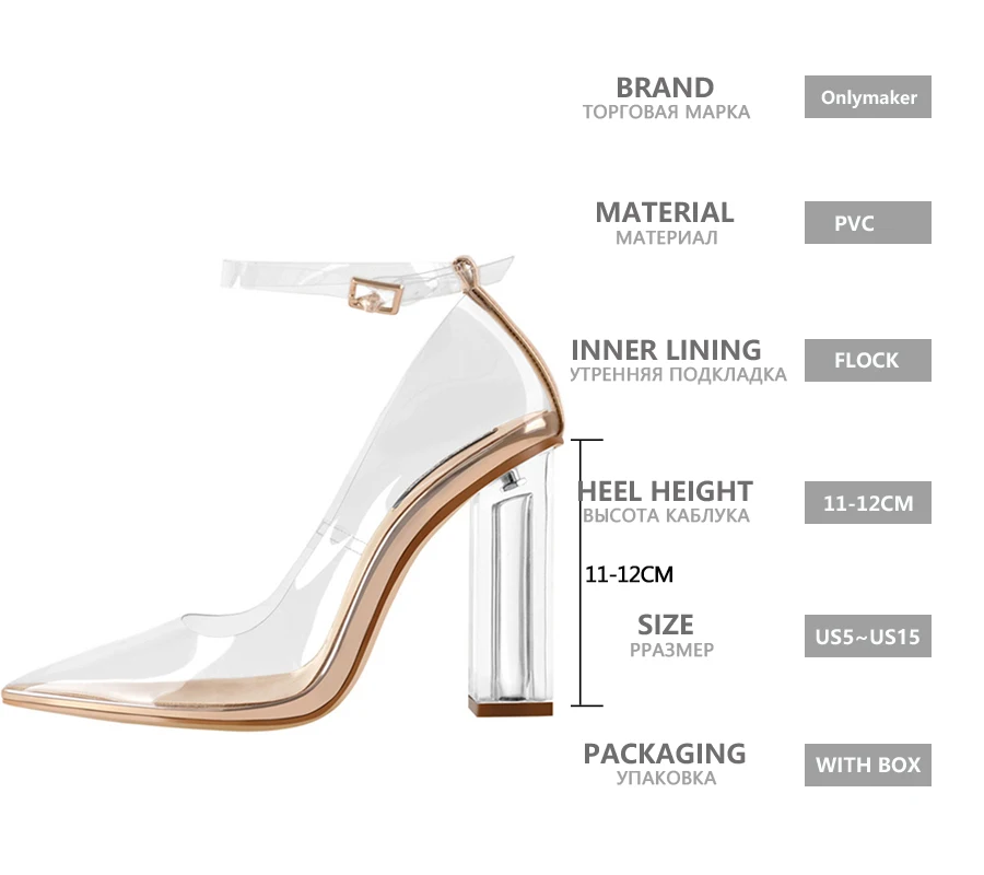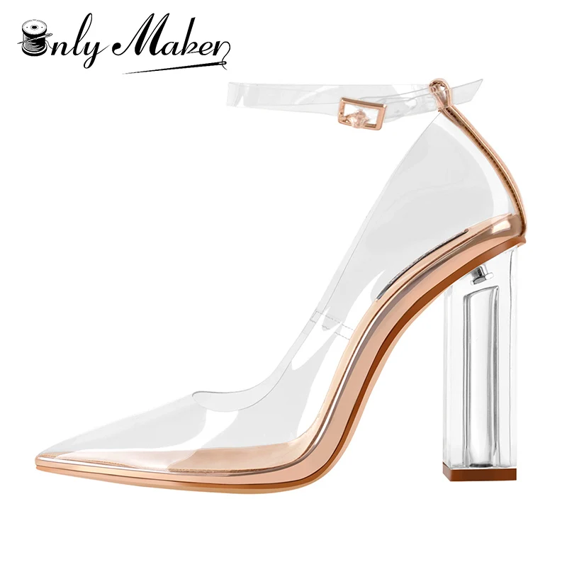 Onlymakerженские прозрачные туфли-лодочки модельные босоножки с острым носком и ремешком на щиколотке на массивном высоком каблуке размеры США 5 - US15