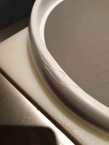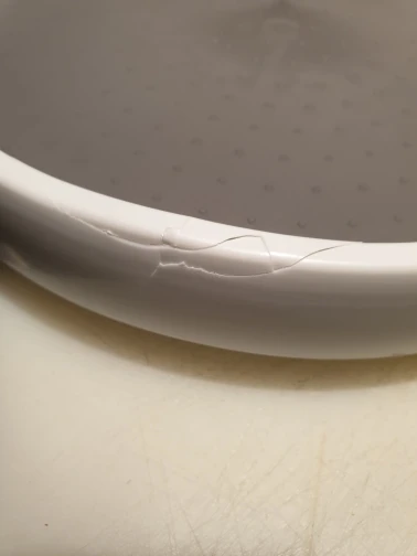 Товар, к сожалению, очень плохо был упакован, поэтому в дороге были повреждены края пластика, а почта РФ просто замотала их скотчем, поэтому увидеть при получении не удалось. Возврат оформлять не стала- муторно! Оставила , но рекомендую такие изделия защищать упаковкой.