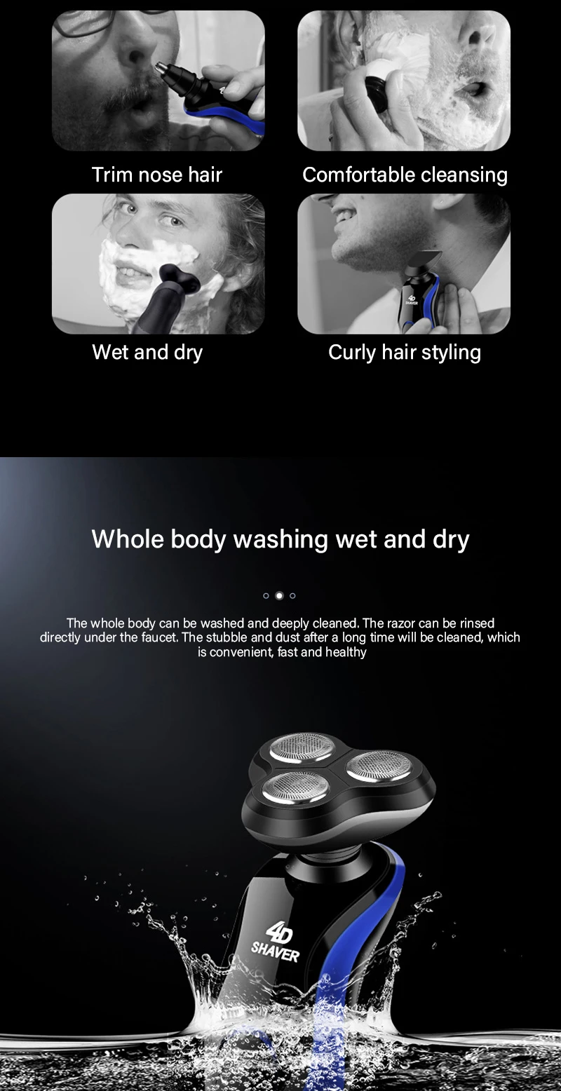 Особенности:Плавающая режущая головка с двойным кольцом, мощная мойка всего телаВодонепроницаемость IPX7, моющаяся, Влажная и сухая, чистая.Безопасное и быстрое бритье, увеличение площади контакта на 50%, лучший захват бороды, чистое и быстрое бритье.Кнопочный переключатель, нескользящая конструкция, кнопка переключения, рельефное использование на дороге более удобно и удобноРежущая головка выбрасывается, волосы выбрасываются и промываются водой после бритья.Стильный дизайн, эргономика и более удобный захват одной машины, три использования, удобнее и быстрее