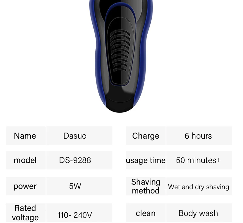 Удобный дизайн кнопки переключенияИндивидуально плавающийЭргономичная ручкаВлажная и сухая бритваИнтерфейс USBНапряжение: 5 ВтНапряжение: 110-240 ВВремя зарядки: 8 часовВремя работы: 60 минутУровень водонепроницаемости: IPX7Совет: режущую головку можно открыть для легкой очистки стружек.