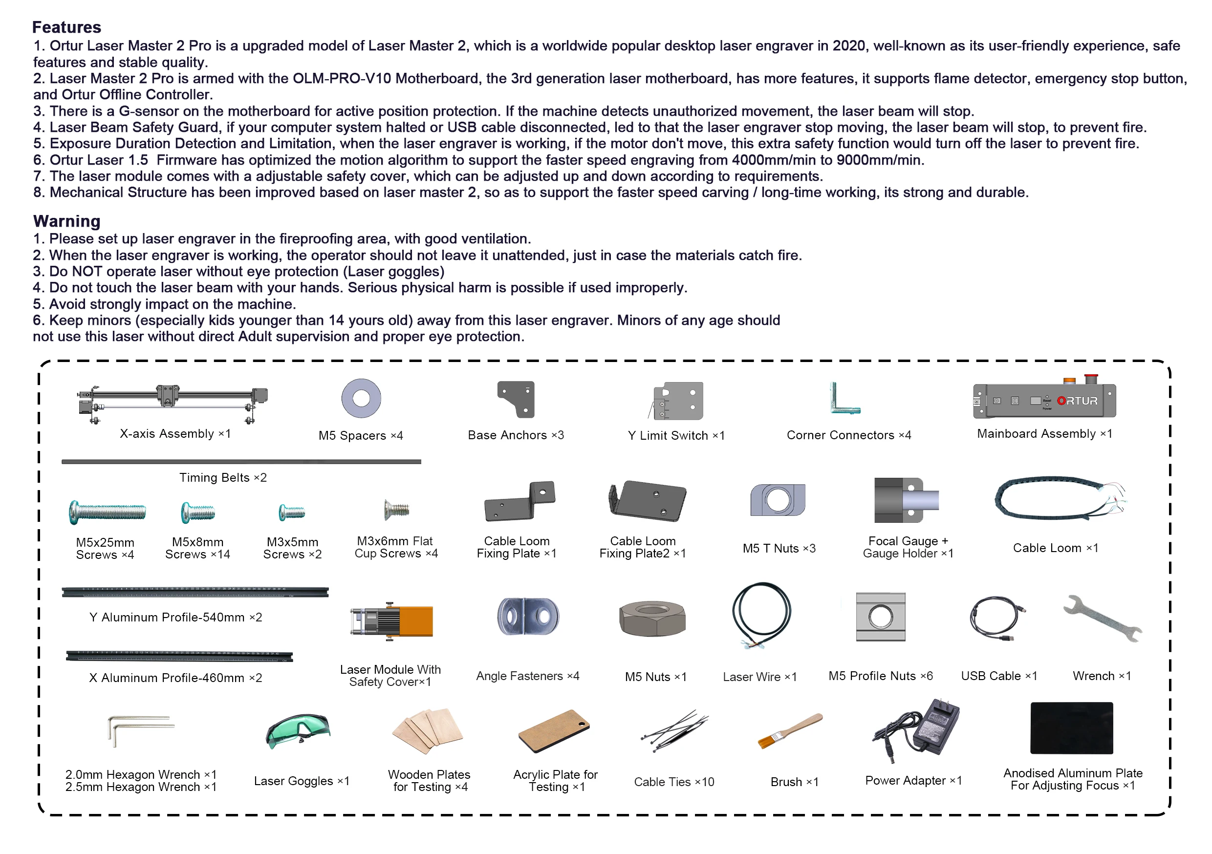 Бренд: OrturНомер модели: Laser Master 2 proТип: лазерная гравировальная машинаМатериал: алюминий + сталь с порошковым покрытиемМощность лазера: LU2-4 лазерный модуль с сжатым фокусным расстоянием 20 Вт (электрическая мощность: 20 Вт, Сила света: 5000-5500 МВт)Дальность достижения лазера: 445 ± 5 нмПитание: адаптер питания 24 В 2 А