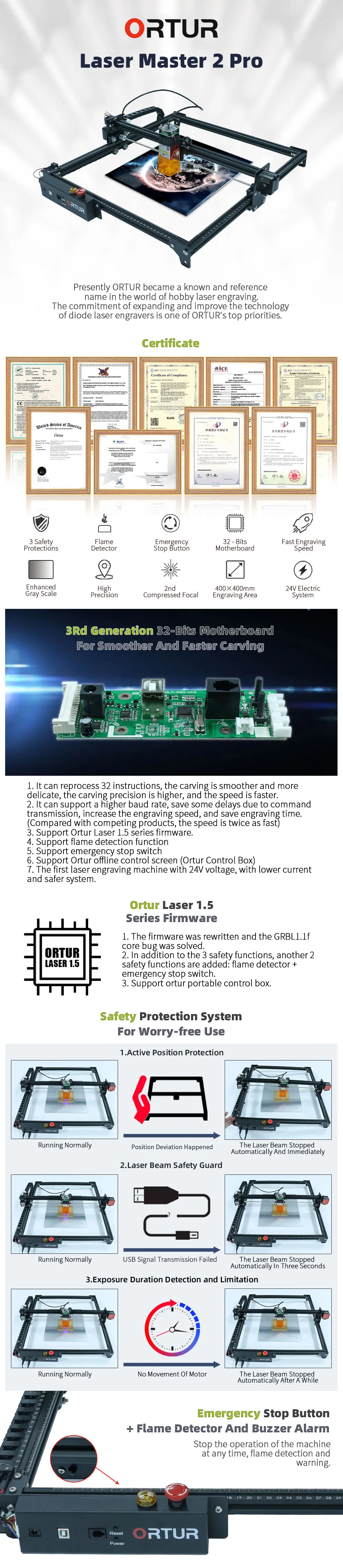 Основные характеристики:●Специализированная материнская плата с 32bit MCUОн может обрабатывать 32 инструкции, поддерживать скорость передачи данных до 921600, более мощный!●Самые передовые 32 бит лазерный гравер прошивкаOrtur laser master прошивка, умнее, быстрее, более высокая точность и проще в использовании.● Диапазон мощности лазера может быть S0 - S1000, по сравнению с 8 битами настольных лазерных гравировальных станков, которые имеют только S0 - S255, Ortur лазерный мастер может контролировать лазерный луч более точно, может даже использовать лазерное устройство высокой мощности, чтобы «нарисовать» изображение на бумаге, О том, что 8 бит высокой мощности лазерные гравировальные инструменты не смог нажать на кнопку.● Скорость гравировки может достигать 10000 мм/мин. (Это может сэкономить половину времени гравировки, чем аналогичные Гравировальные Машины хобби)