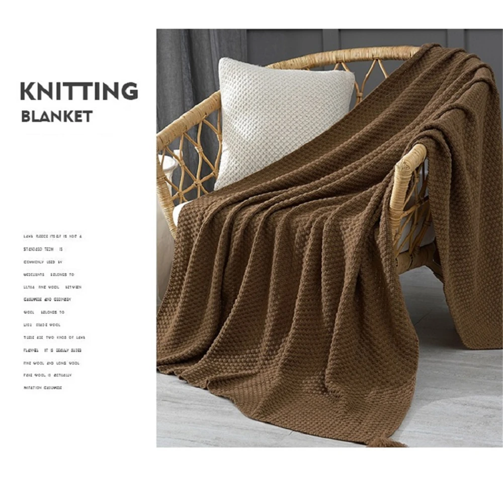 Плетеное одеяло с кисточкой, однотонное бежевое, серое, кофейного ц...