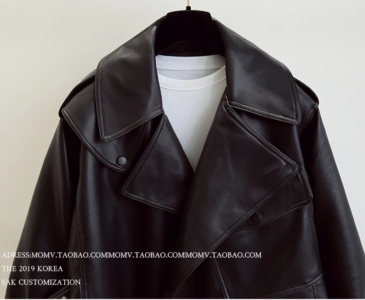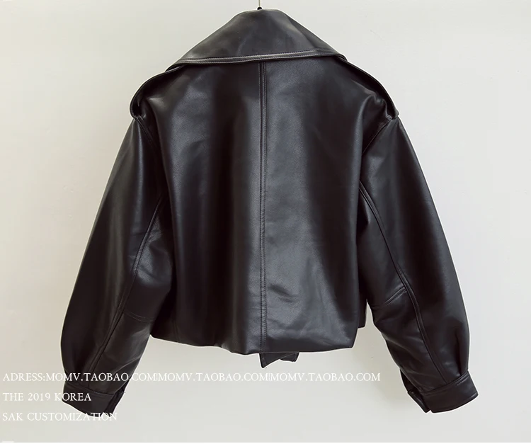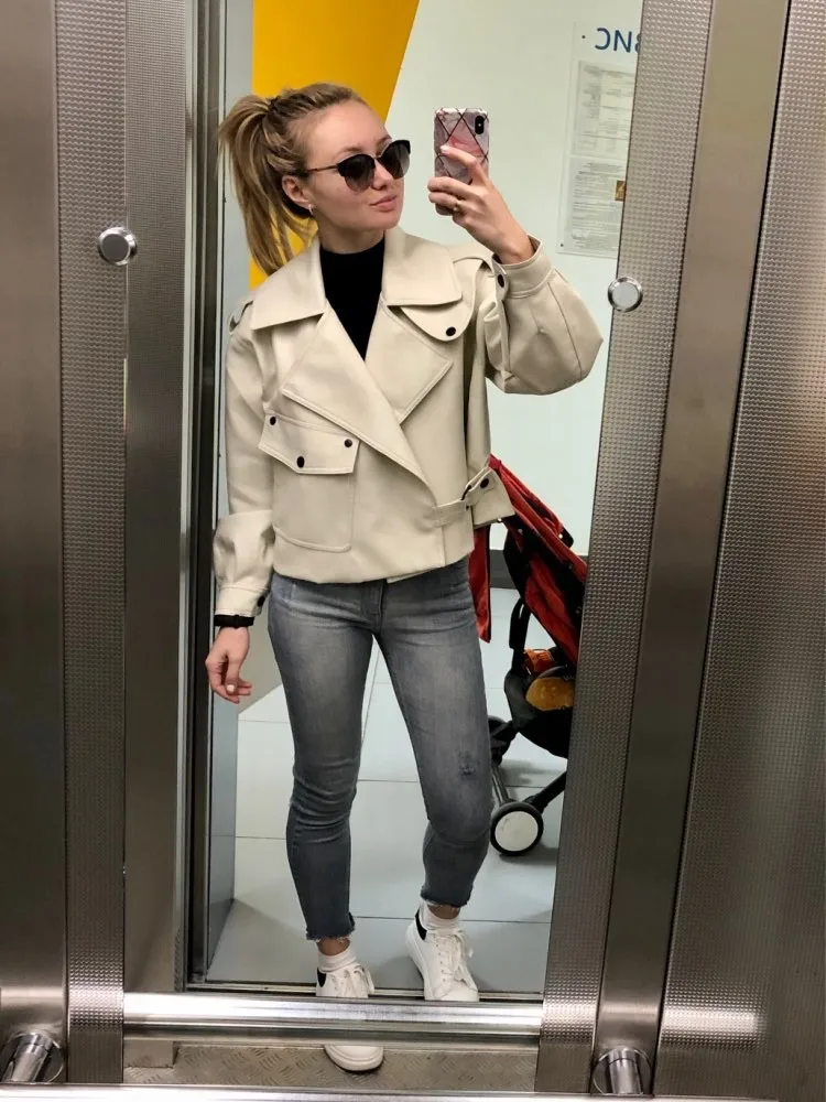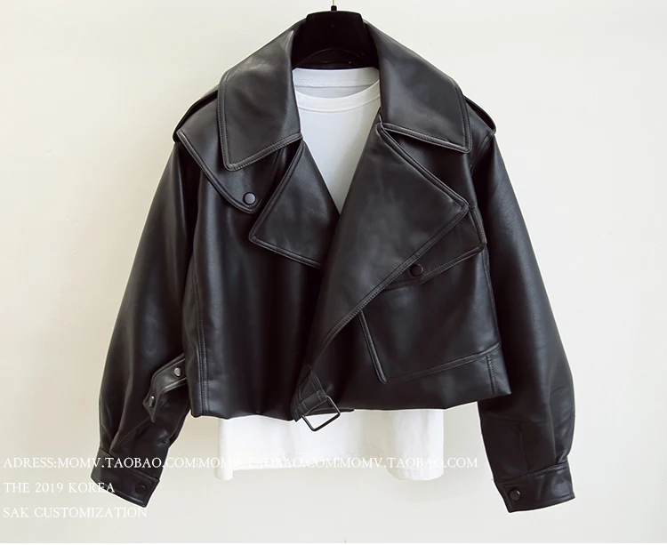 Куртка женская короткая из экокожи, уличная одежда свободного покроя, черная верхняя одежда с отложным воротником, весна-осень