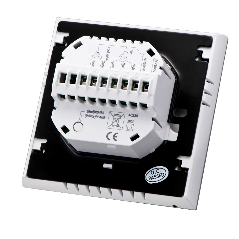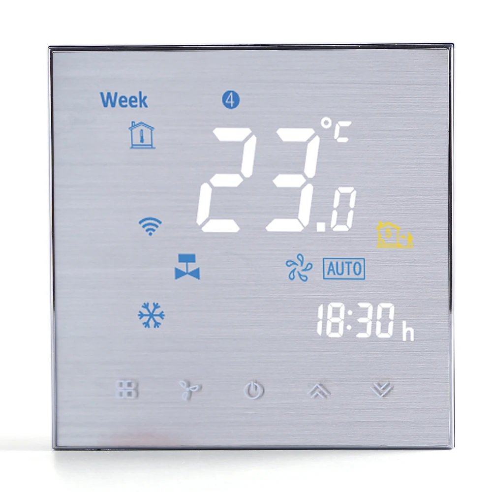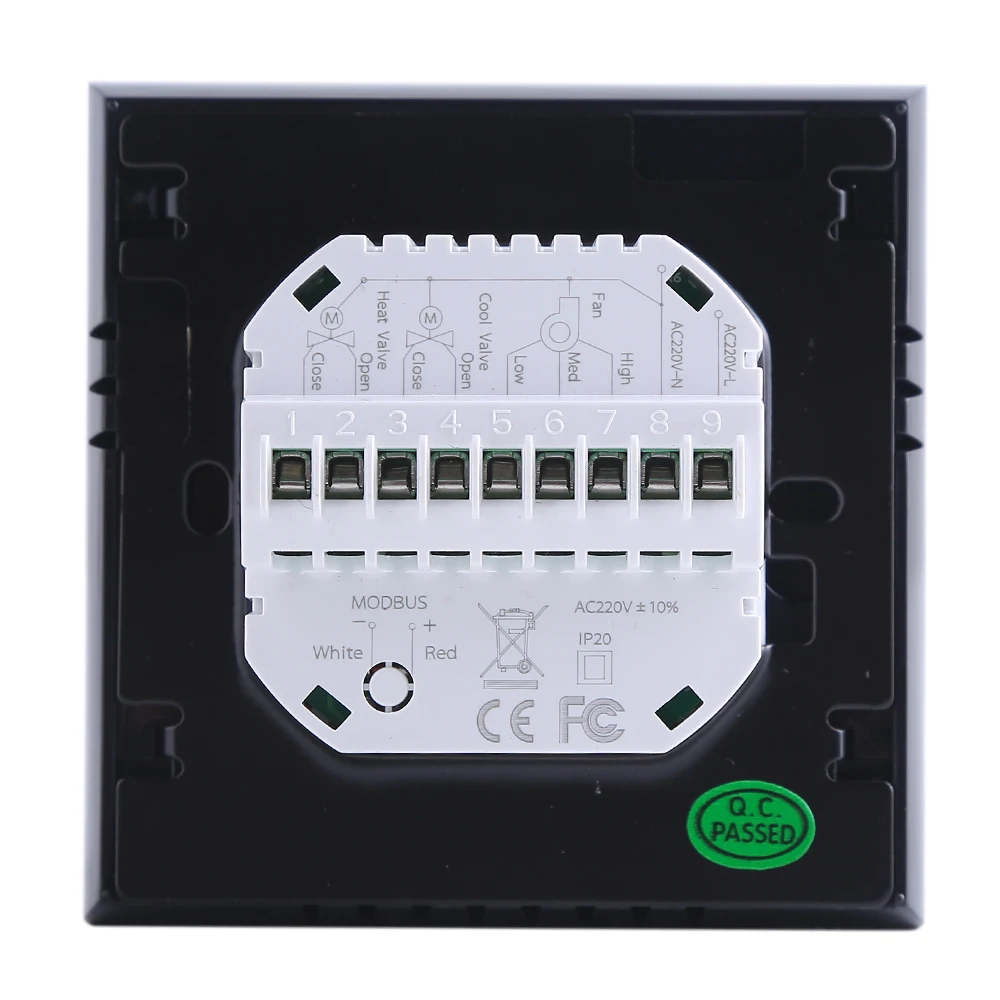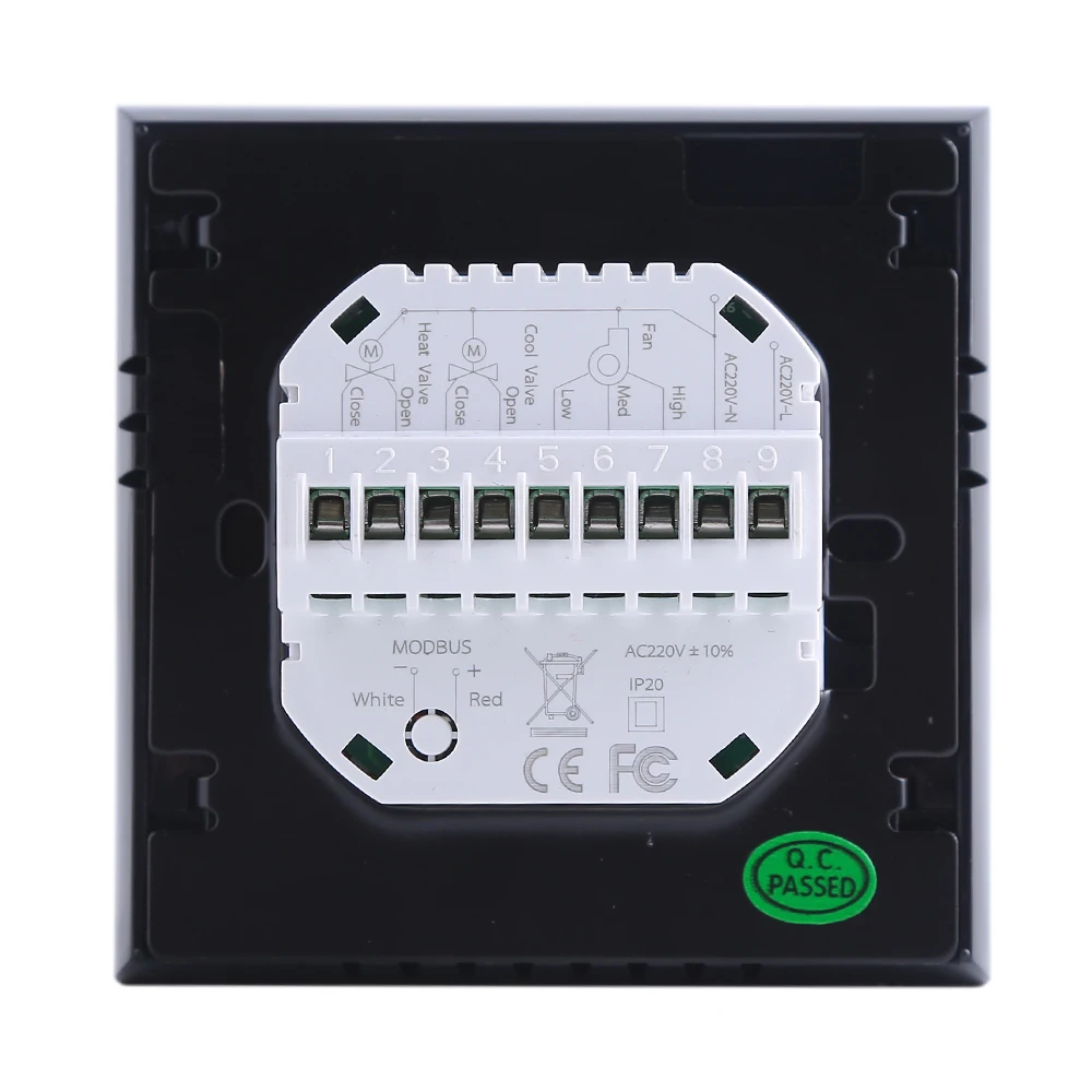 Современные термостаты с круглым сенсорным экраном серии BAC-300 предназначены для включения/выключения контроля вентиляторов и клапанов в приложениях кондиционера с помощью сравнения комнатной температуры и температуры настройки. Для достижения цели комфорта и экономии энергии.Особенности:Доступны мощные функции, такие как Modbus/WIFI и т. Д.0,5 °C точность держит температуру в рамках одного уровня вы установите.Память часов при выключении питания.5 + 2 шесть циклов программирования обеспечивают максимальный комфорт и экономичность.Создайте группу термостатов для центрального управления.Все языки настройки синхронизируют ваш часовой пояс, адрес и язык.Нет ограничений для добавления комнат и поддержки умной сцены.Характеристики:Материал корпуса: поликарбонат + АБС (огнестойкий)Модель: BAC-3000AL, BAC-3000ALW, BAC-3000EL, BAC-3000ELW (опционально)Цвет:BAC-3000AL, BAC-3000ALW, BAC-3000EL, BAC-3000ELW: белый, черныйBAC-3000ALW, BAC-3000ELW: серебристый (опционально)Источник питания: 95 ~ 240 В переменного тока, 50 ~ 60 ГцСопротивление реле вентилятора: 5A; Индуктивный: 3AСопротивление реле клапана: 3A; Индуктивный: 1AСенсор: NTC3950, 10KТочность: ± 0,5 ℃Установите температуру. Диапазон: 5 -35 ℃Температура экрана. Диапазон: 5 ~ 99 ℃Температура окружающей среды. : 0 ~ 45 ℃Влажность окружающей среды: 5 ~ 95% RH (без конденсации)Температура хранения. : -5 ~ 45 ℃Мощность Потребляемая мощность: <1,5 WОшибка синхронизации: < 1%Установочная коробка: 86*86 мм квадратная или европейская 60 мм круглая коробкаПроволочные выводы: провода 2x1,5 mm2 или 1x2,5 mm2Класс защиты: IP20Кнопки: емкостные сенсорные кнопкиСотовый: кнопка CR1220 (не входит в комплект)Размер изделия: 86*86 мм/3,39*3,39 дюймовПосылка:BAC-3000AL/BAC-3000ALW: 220 г/7,76 унцийBAC-3000EL/BAC-3000ELW: 224 г/7,9 унцийРазмер посылка: 108*90*60 мм/4,25*3,54*2,36 дюймовОпределение модели:A: две трубы; Блок катушки вентилятора управления и два проводных моторизованных клапанаL: подсветкаW: подключение WifiE: четыре трубы; Блок катушки вентилятора управления и два проводных тепловых клапана и два проводных крутых клапанаПримечание:Термостат только используется для Центральной кондиционирование воздуха системы и управления вентиляторный доводчик с водяным охлаждением.Два трубных клапана: горячая вода зимой для отопления, а холодная вода летом для охлаждения.Четыре трубных клапана: холодная и горячая вода одновременно, нагревание и охлаждение в любое время.Упаковочный лист:1 * термостат2 * винты1 * настенная пластина1 * Руководство пользователя