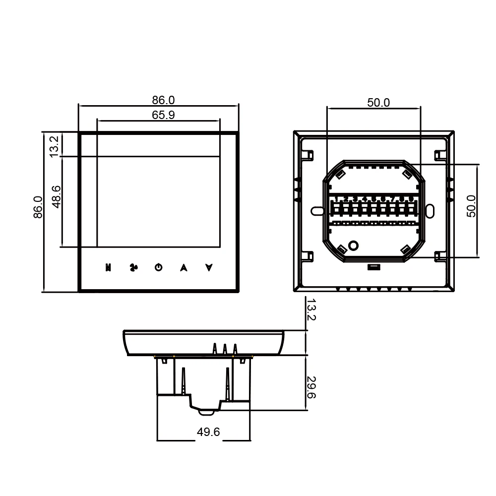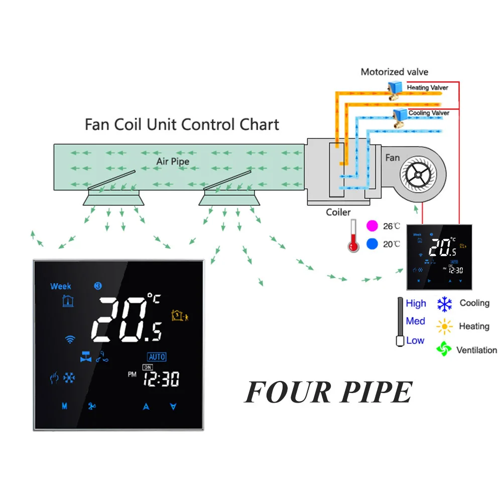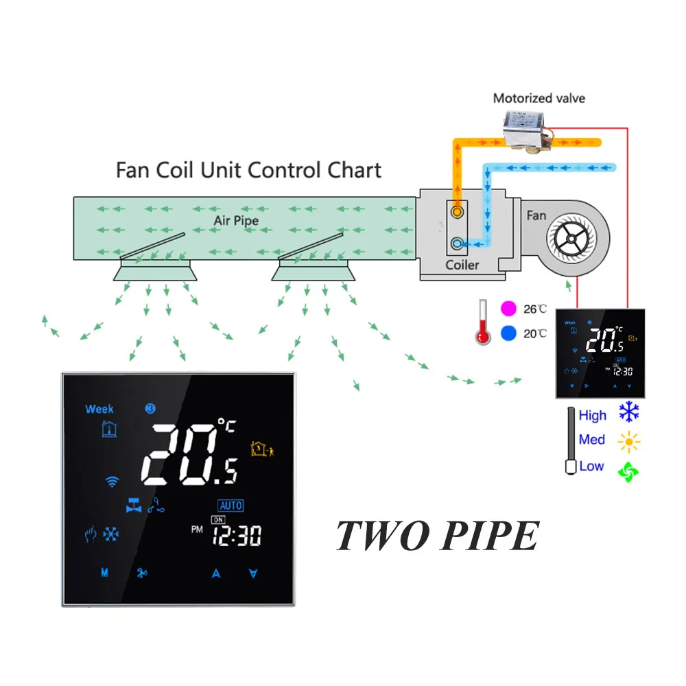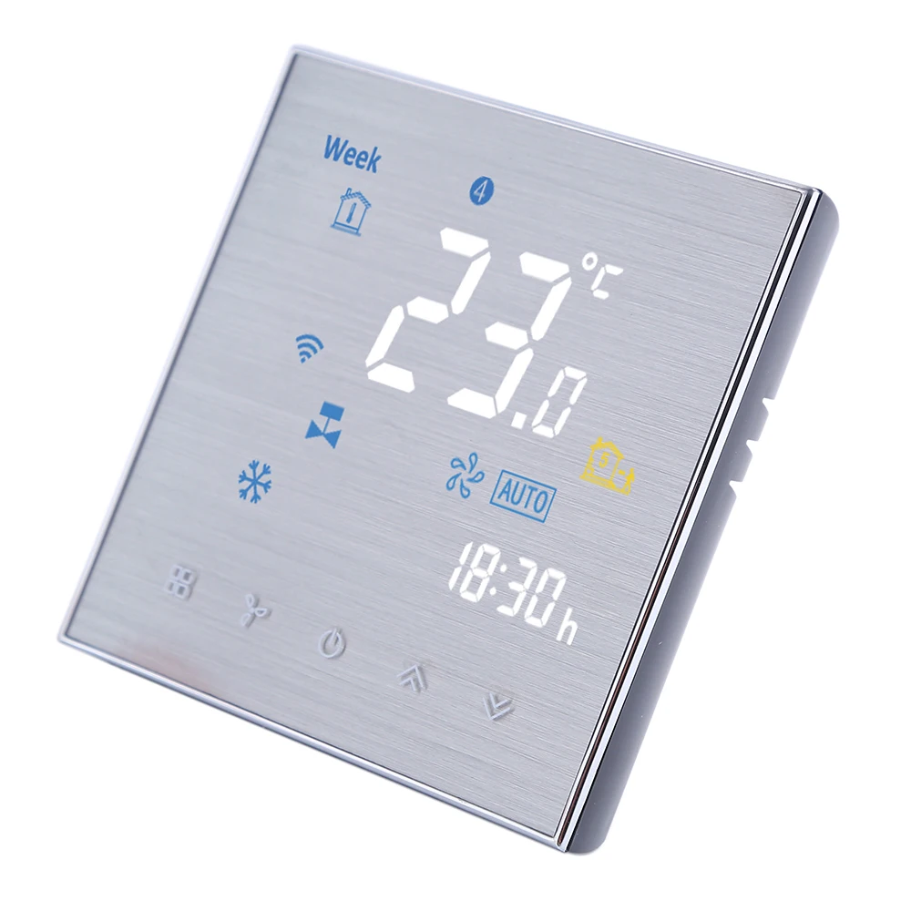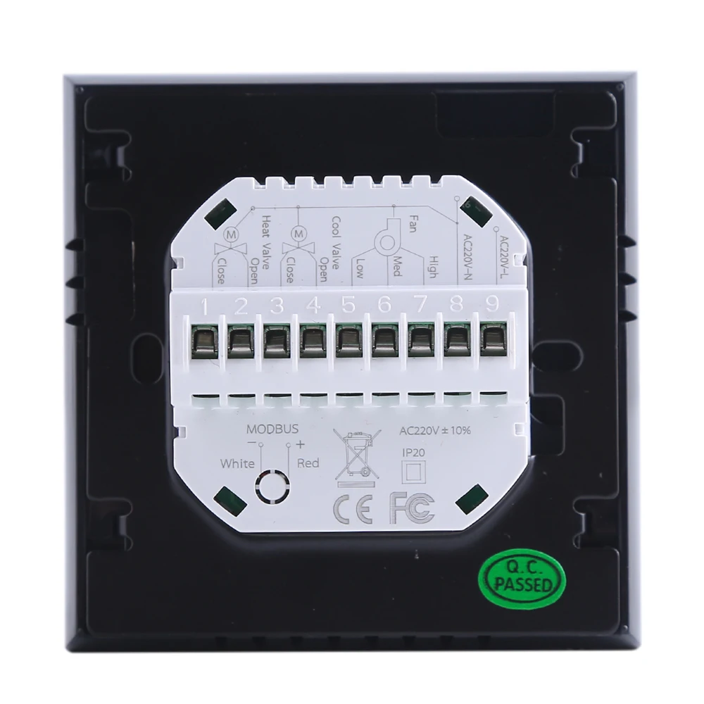 Современные термостаты с круглым сенсорным экраном серии BAC-300 предназначены для включения/выключения контроля вентиляторов и клапанов в приложениях кондиционера с помощью сравнения комнатной температуры и температуры настройки. Для достижения цели комфорта и экономии энергии.Особенности:Доступны мощные функции, такие как Modbus/WIFI и т. Д.0,5 °C точность держит температуру в рамках одного уровня вы установите.Память часов при выключении питания.5 + 2 шесть циклов программирования обеспечивают максимальный комфорт и экономичность.Создайте группу термостатов для центрального управления.Все языки настройки синхронизируют ваш часовой пояс, адрес и язык.Нет ограничений для добавления комнат и поддержки умной сцены.Характеристики:Материал корпуса: поликарбонат + АБС (огнестойкий)Модель: BAC-3000AL, BAC-3000ALW, BAC-3000EL, BAC-3000ELW (опционально)Цвет:BAC-3000AL, BAC-3000ALW, BAC-3000EL, BAC-3000ELW: белый, черныйBAC-3000ALW, BAC-3000ELW: серебристый (опционально)Источник питания: 95 ~ 240 В переменного тока, 50 ~ 60 ГцСопротивление реле вентилятора: 5A; Индуктивный: 3AСопротивление реле клапана: 3A; Индуктивный: 1AСенсор: NTC3950, 10KТочность: ± 0,5 ℃Установите температуру. Диапазон: 5 -35 ℃Температура экрана. Диапазон: 5 ~ 99 ℃Температура окружающей среды. : 0 ~ 45 ℃Влажность окружающей среды: 5 ~ 95% RH (без конденсации)Температура хранения. : -5 ~ 45 ℃Мощность Потребляемая мощность: <1,5 WОшибка синхронизации: < 1%Установочная коробка: 86*86 мм квадратная или европейская 60 мм круглая коробкаПроволочные выводы: провода 2x1,5 mm2 или 1x2,5 mm2Класс защиты: IP20Кнопки: емкостные сенсорные кнопкиСотовый: кнопка CR1220 (не входит в комплект)Размер изделия: 86*86 мм/3,39*3,39 дюймовПосылка:BAC-3000AL/BAC-3000ALW: 220 г/7,76 унцийBAC-3000EL/BAC-3000ELW: 224 г/7,9 унцийРазмер посылка: 108*90*60 мм/4,25*3,54*2,36 дюймовОпределение модели:A: две трубы; Блок катушки вентилятора управления и два проводных моторизованных клапанаL: подсветкаW: подключение WifiE: четыре трубы; Блок катушки вентилятора управления и два проводных тепловых клапана и два проводных крутых клапанаПримечание:Термостат только используется для Центральной кондиционирование воздуха системы и управления вентиляторный доводчик с водяным охлаждением.Два трубных клапана: горячая вода зимой для отопления, а холодная вода летом для охлаждения.Четыре трубных клапана: холодная и горячая вода одновременно, нагревание и охлаждение в любое время.Упаковочный лист:1 * термостат2 * винты1 * настенная пластина1 * Руководство пользователя