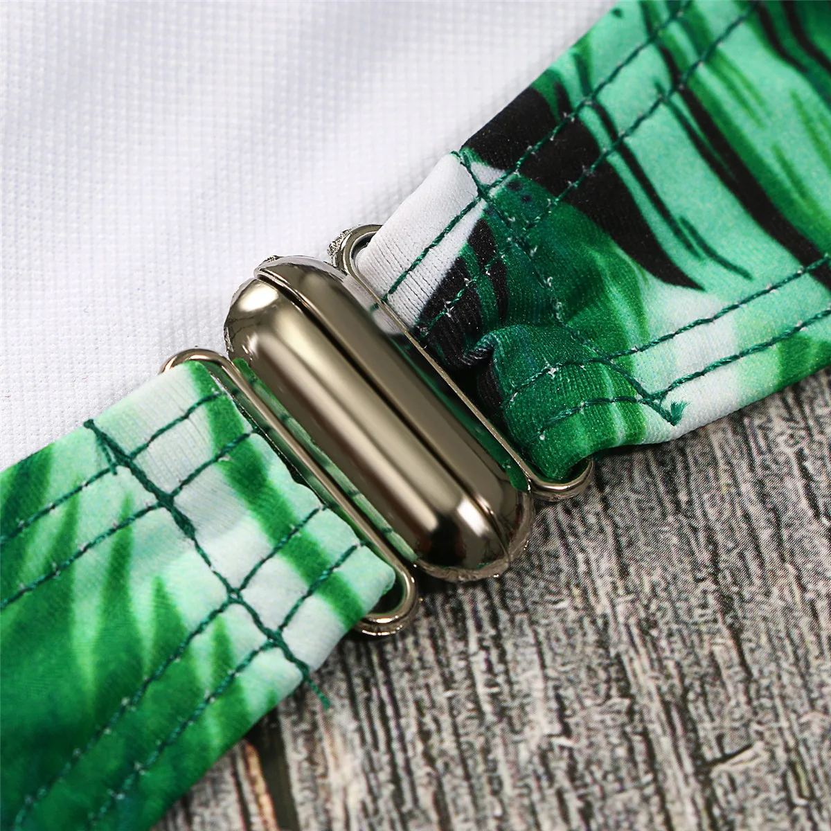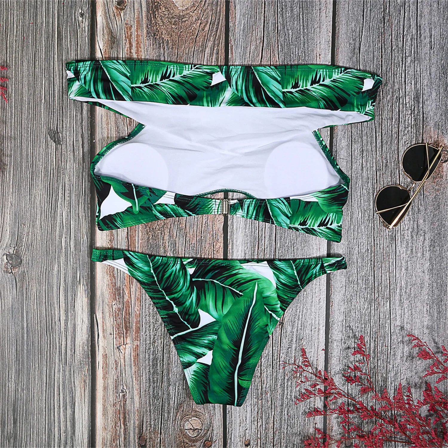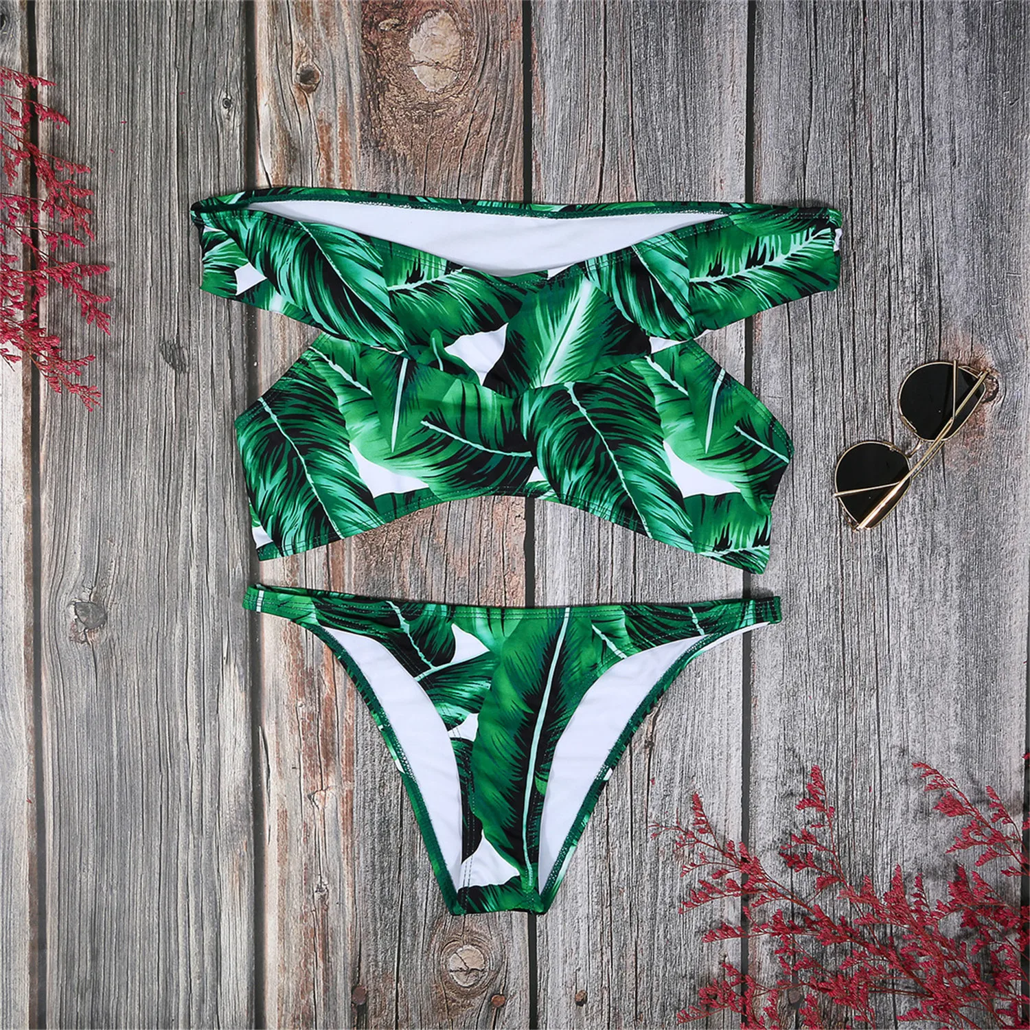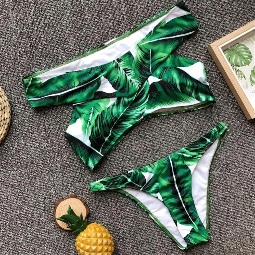Для женщин s фон с изображением листочков и печать с повязкой через шею, бикини, купальник Для женщин купальник без бретелек комплект с бюстгальтером цвета: зеленый, ванный комплект, Бразильский бикини, женский
