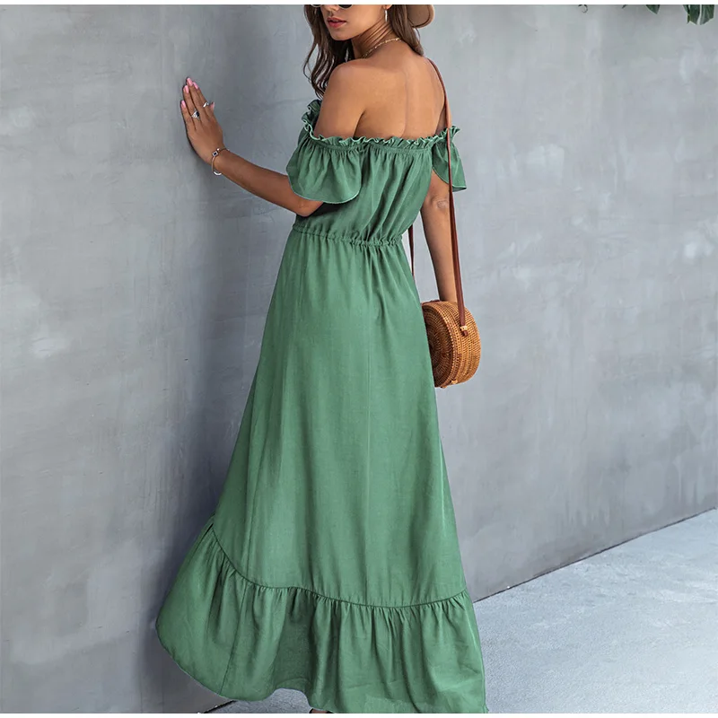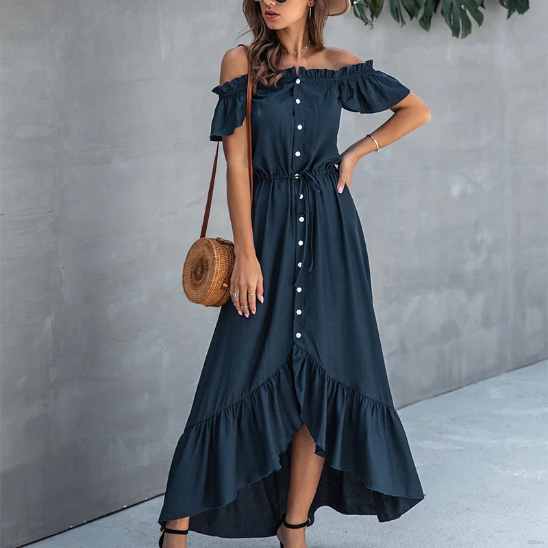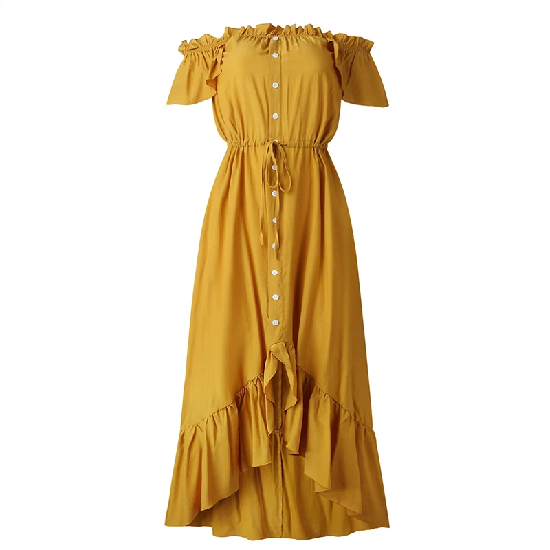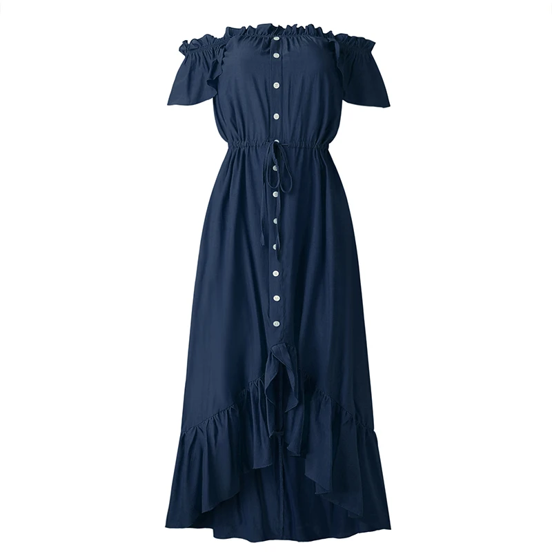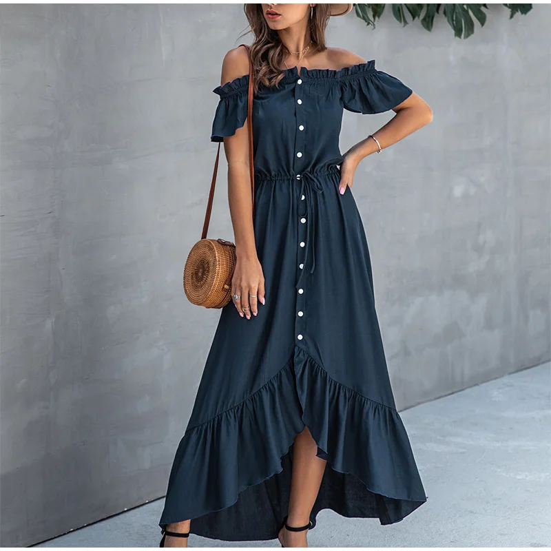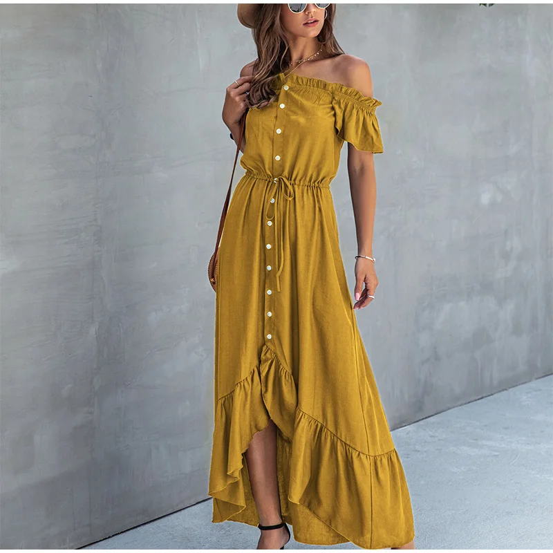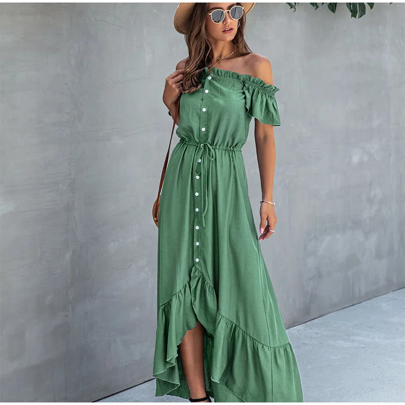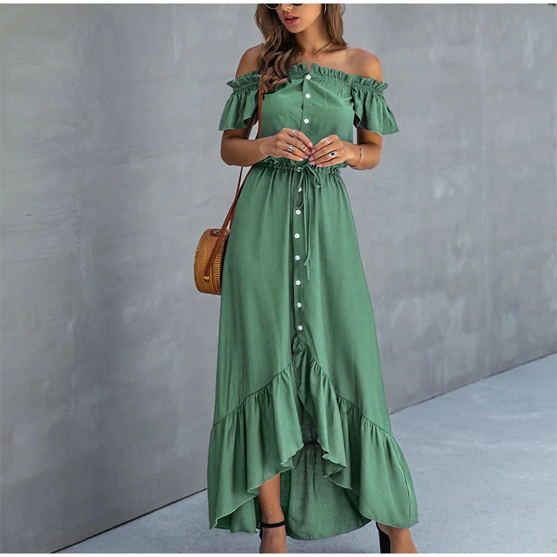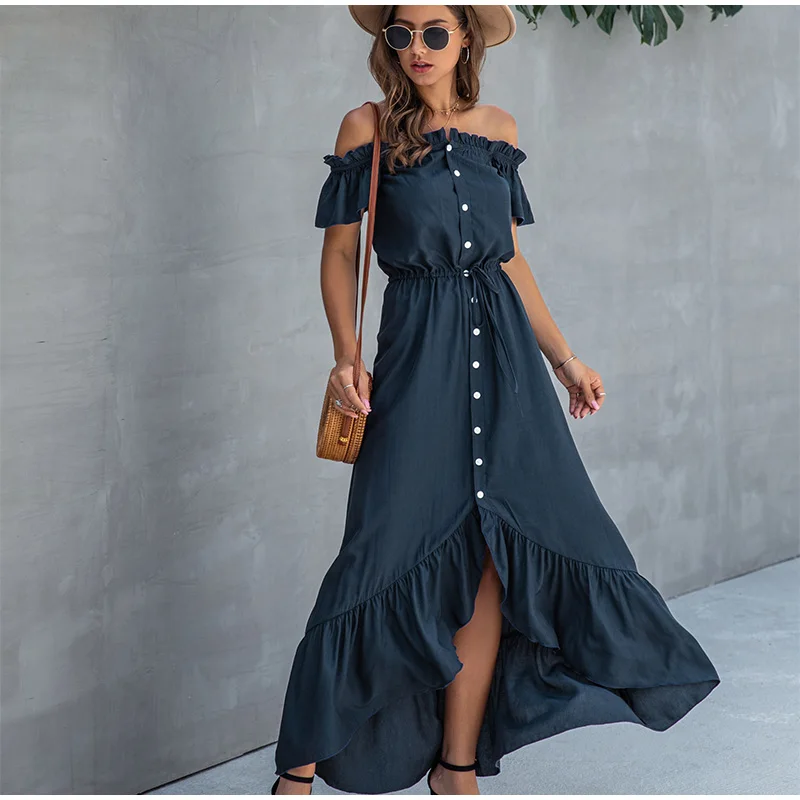 Женское асимметричное платье с вырезом лодочкой, без бретелек, на пуговицах, с оборками, с высокой талией, длинные платья для женщин, летняя модная женская одежда