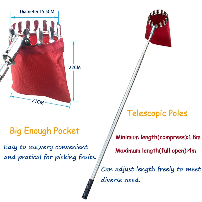 1) прост в использовании, очень удобен и практичен для сбора фруктов. 2) с помощью телескопических полюсов вы можете свободно регулировать длину, чтобы соответствовать различным потребностям. 3) Используйте зубцы кольца, чтобы разрезать фрукты и собрать их в мешок.