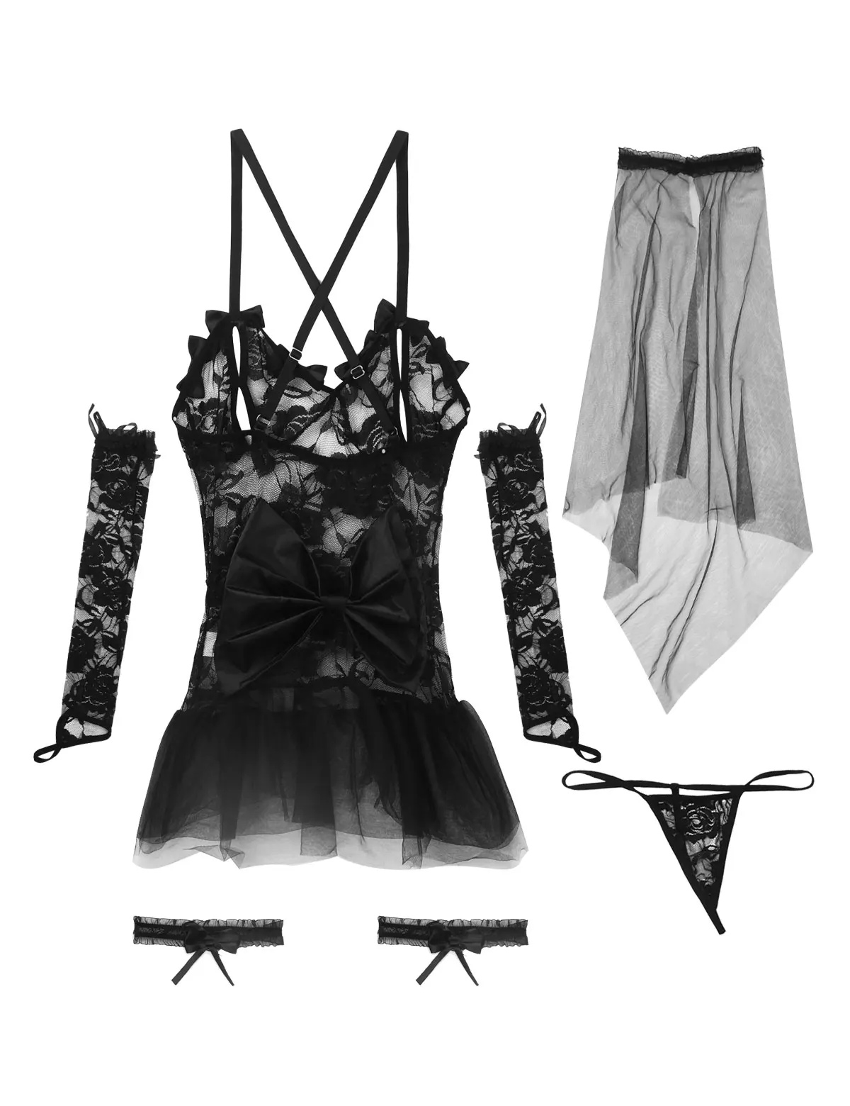 Особенности: Комплект женского нижнего белья для ролевых игр невесты из 5 предметов, мягкая и легкая ткань, прозрачный дизайн. Регулируемые бретели-спагетти перекрещиваются сзади. Сзади застрочен большой бант. Лиф топа из цветочного кружева с подолом из сетки. Сочетающиеся стринги и одна пара подвязок для ног, перчатки с петлей для пальцев, головной убор крепится с помощью вуали, удобно носить. Идеальный подарок для дам, жены и подруги на День святого Валентина, свадебную ночь или медовый месяц. Перед заказом внимательно ознакомьтесь с размером, ручная стирка в холодной воде.