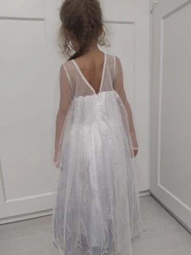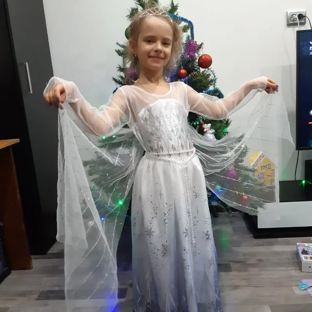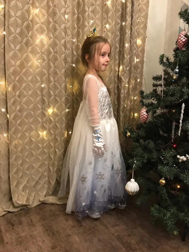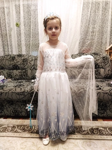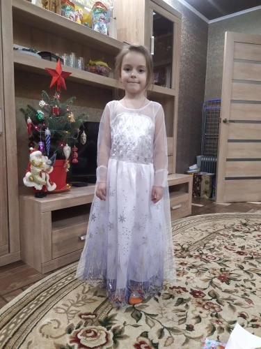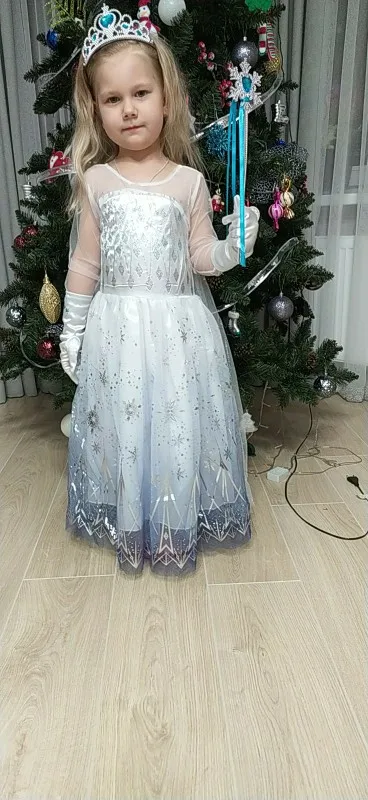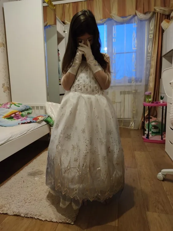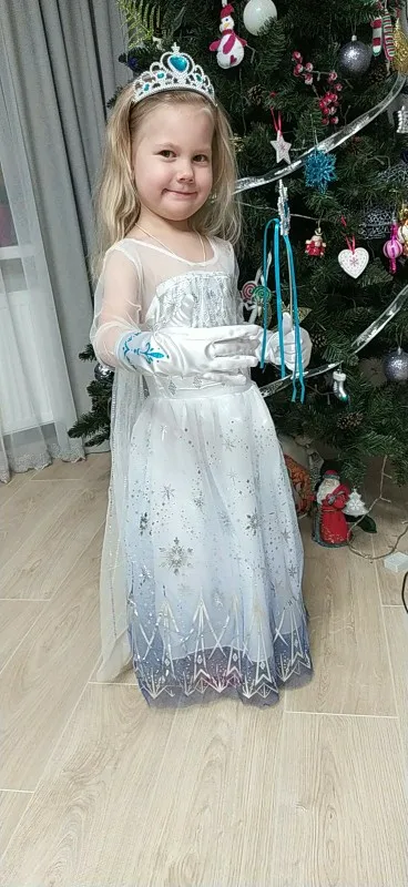 Очень красивое платье получили! На рост 116 взяли размер 130. Получилось немного на вырост, но не критично. Единственный минус, перчатки с дырками. И продавец положил в подарок объемные наклейки с мультяшками. Благодарю.