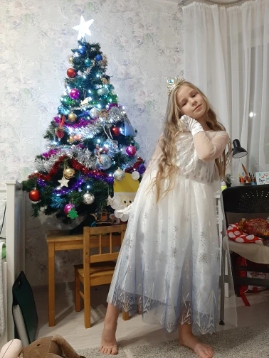 отличное платье, на возраст 5,5 взяла размер 7Т - 8Т. немного велико, до самого пола, на следующий новый год будет как раз! покупала за 1211 рублей. но перчатки как раз сейчас! рекомендую. Платье нарядное, очень красивое. заказала и оплатила 31.12.2020 - забрала в постамате в Орехово-зуево уже 14.01.2021