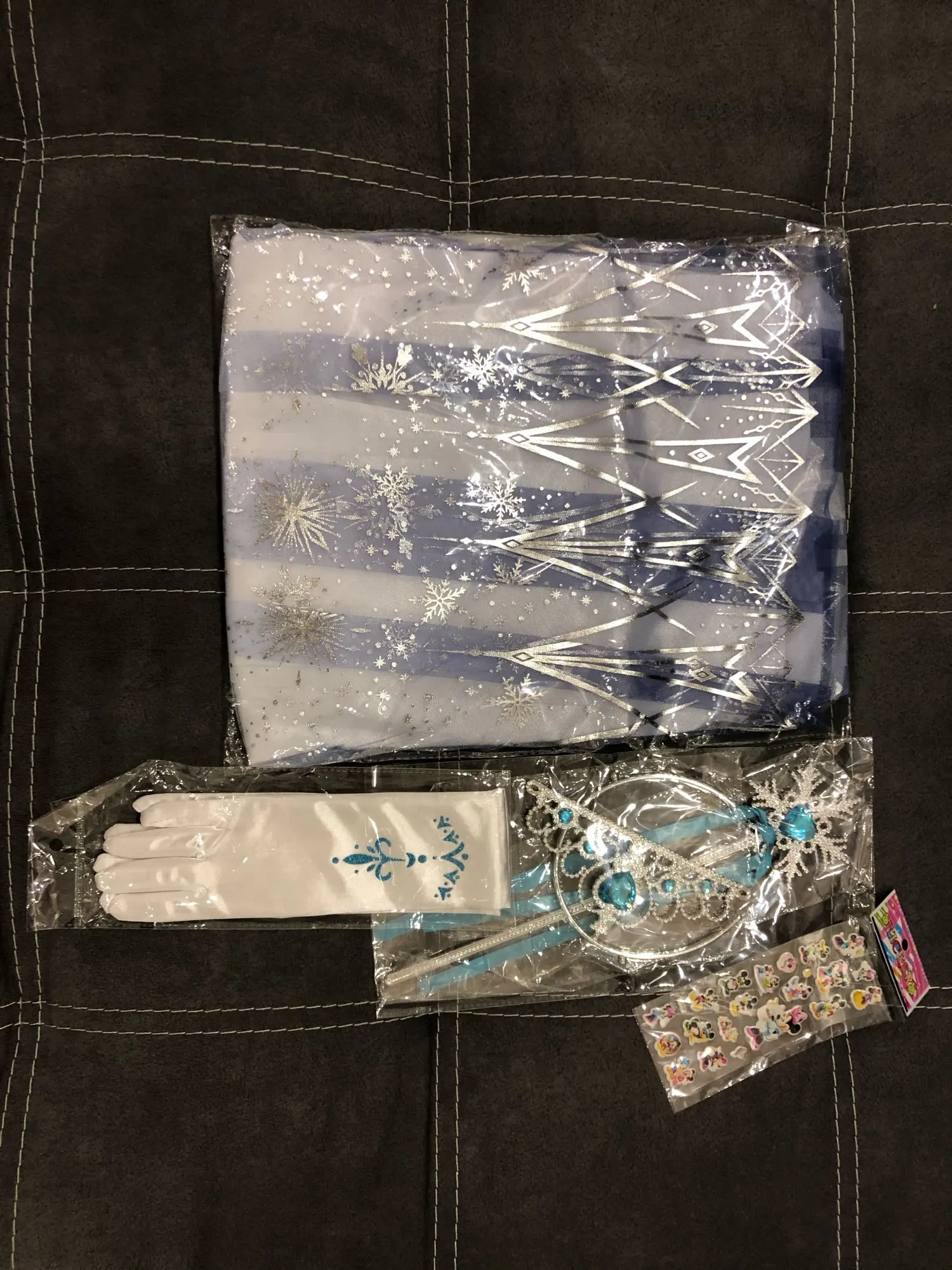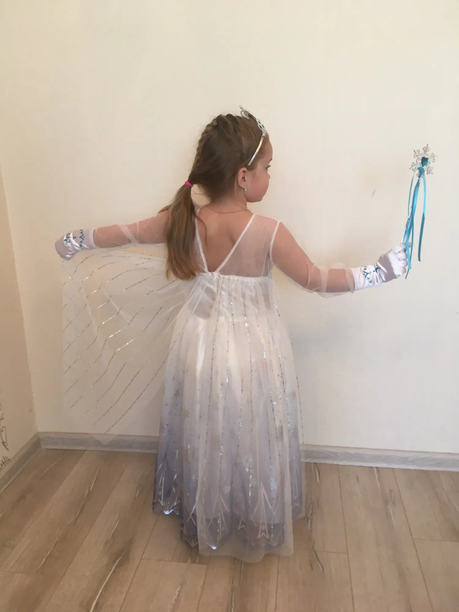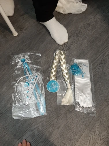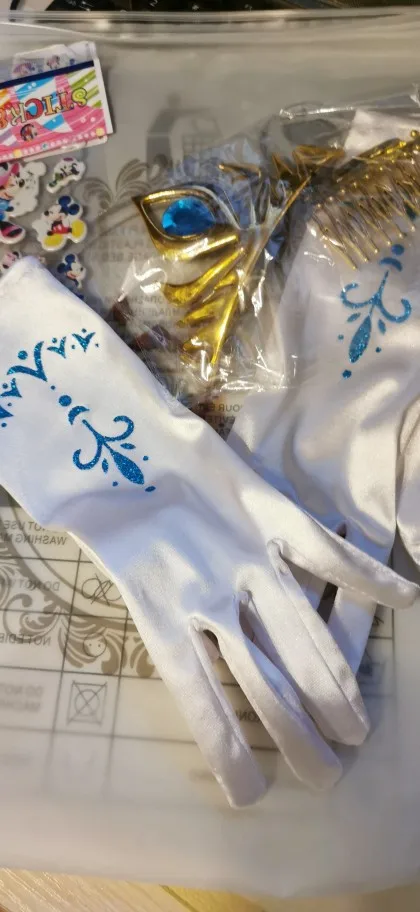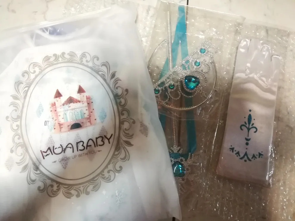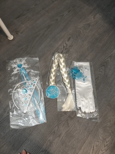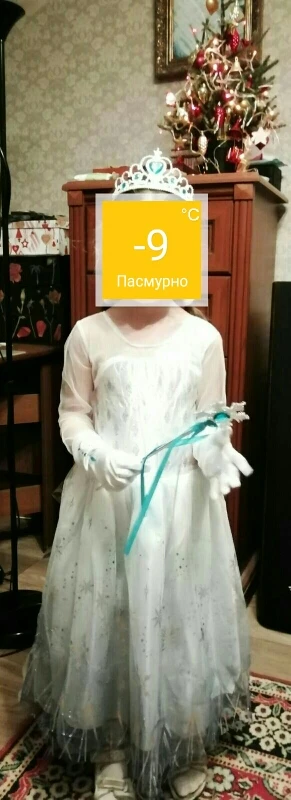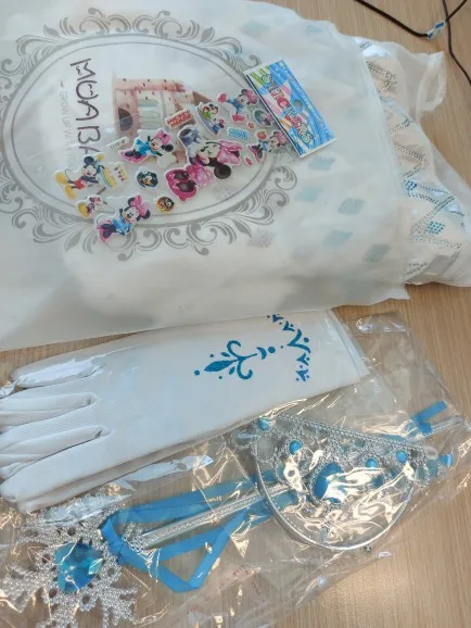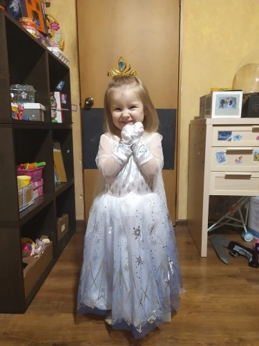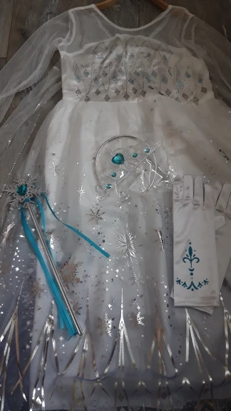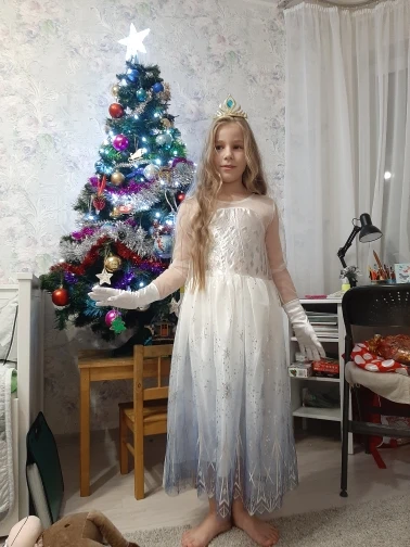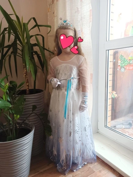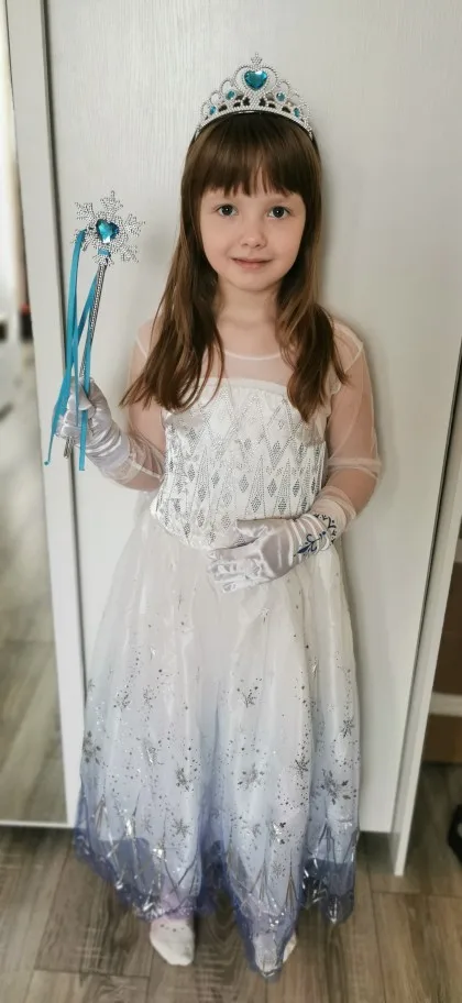 Нереально красивый наряд! Аксессуары все очень аккуратно сделаны. Товар соответствует описанию. Рекомендую продавца и товар. На рост 105 см немного великовато, но это не страшно. Перчатки тоже велики, но меньше вряд ли можно найти. Корона идёт в разобранном виде. Пришло просто в пакете. Доставка быстрая