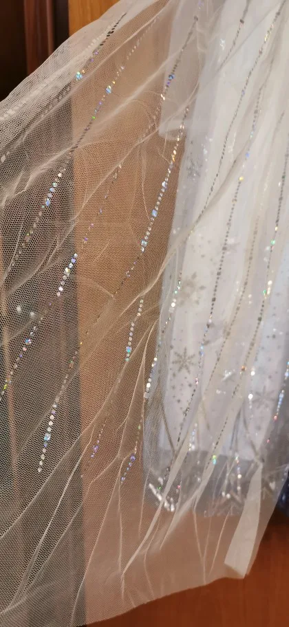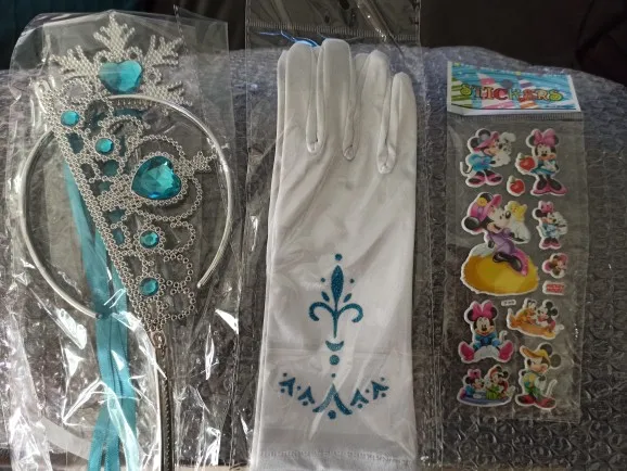 Это прекрасный набор. Перчатки и диадема хорошо сделаны. Диадема сборная из двух частей, при сборе конструкции нужно стараться не прикладывать излишних усилий, чтобы не сломать. Угол наклона диадемы можно регулировать. Платье очень красивое, все мелкие стразы на месте, швы аккуратные. Длина двух шлейфов с двух сторон равна длине платья, что очень удобно для ходьбы ребёнка. Платье идеально подошло на девочку ростом 140 см, вес 30 кг. На худощавом ребёнке не очень хорошо может смотреться из-за излишней свободы облегания. Набор доставлялся чуть больше месяца. С продавцом не общались.