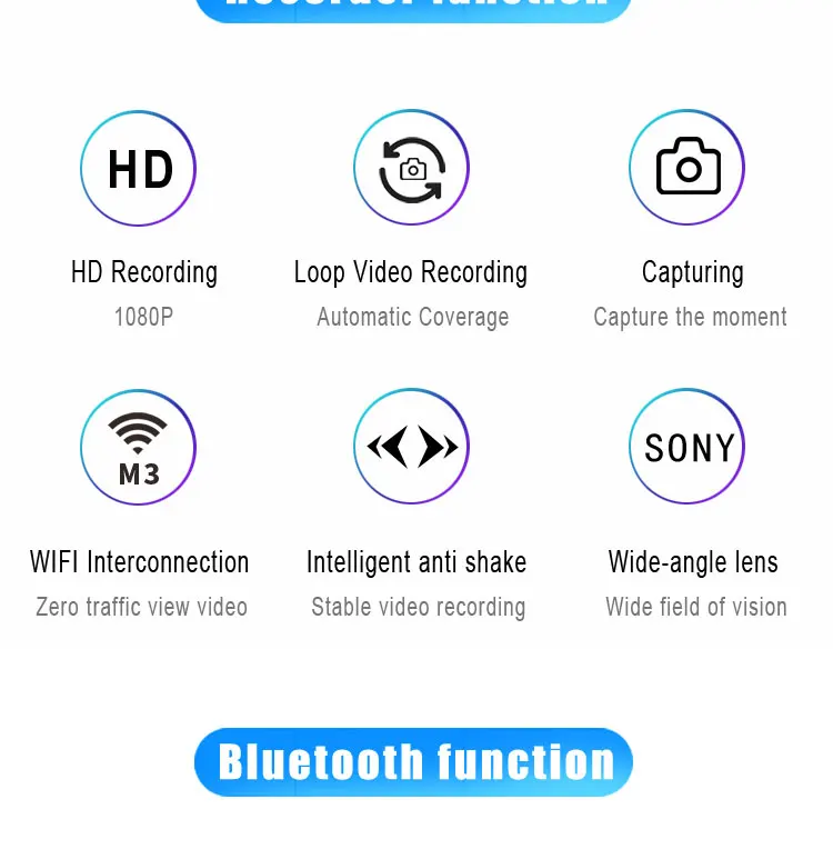 Характеристики:Рабочий диапазон: до 1000 метровВремя работы в режиме ожидания по Bluetooth: до 500 часовВремя работы по Bluetooth: до 32 часовВремя записи: до 7 часовВремя записи в режиме ожидания: до 500 часовВремя зарядки: около 2,5 часовРазрешение видео: 1080PОбъектив: широкоугольный объектив Sony HD