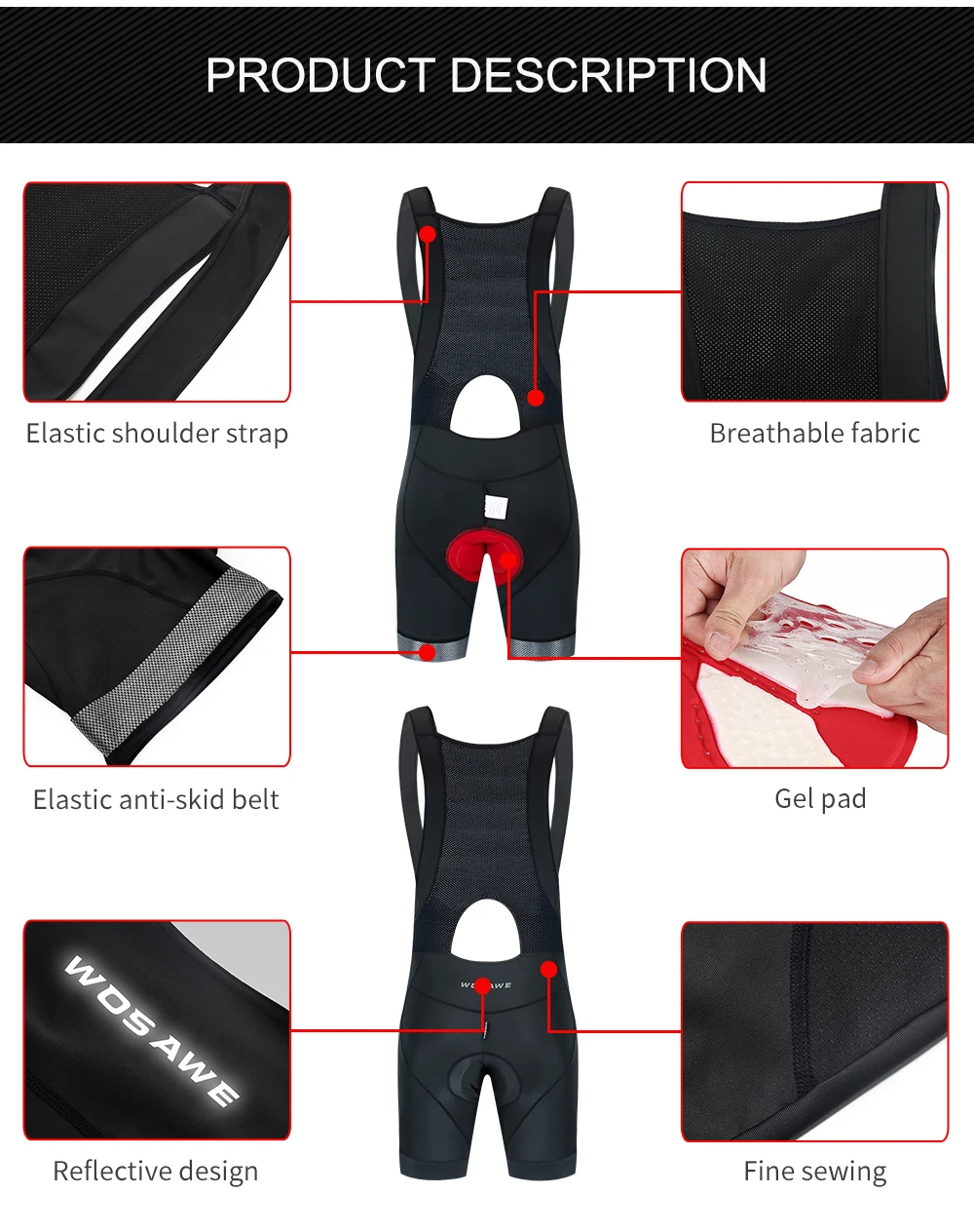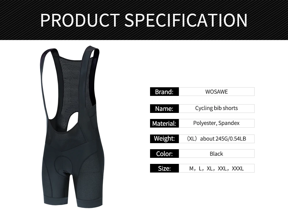 Описание BL153:WOSAWE летний Открытый Велоспорт нагрудник шортыПодходит для бега, велоспорта и многих видов спорта на открытом воздухеОсобенности продукта:Изящный пошивНатуральная посадкаБыстрая сушкаМягкий и против морщинЭластичный Противоскользящий поясЛегкий и дышащийДизайн светоотражающего материала с логотипомВнутренняя трехмерная силиконовая подушкаПосылка включает в себя: 1 велотренажерСпецификация:Название: велосипедные шортыЦвет: черныйМатериал: полиэстер, спандексРазмер: M, L, XL, 2XL, 3XL,Вес: (XL) около 245 г/0.54LBПол: человекПрименение: Велоспорт, бег, туризм, альпинизм и другие виды спорта на открытом воздухе