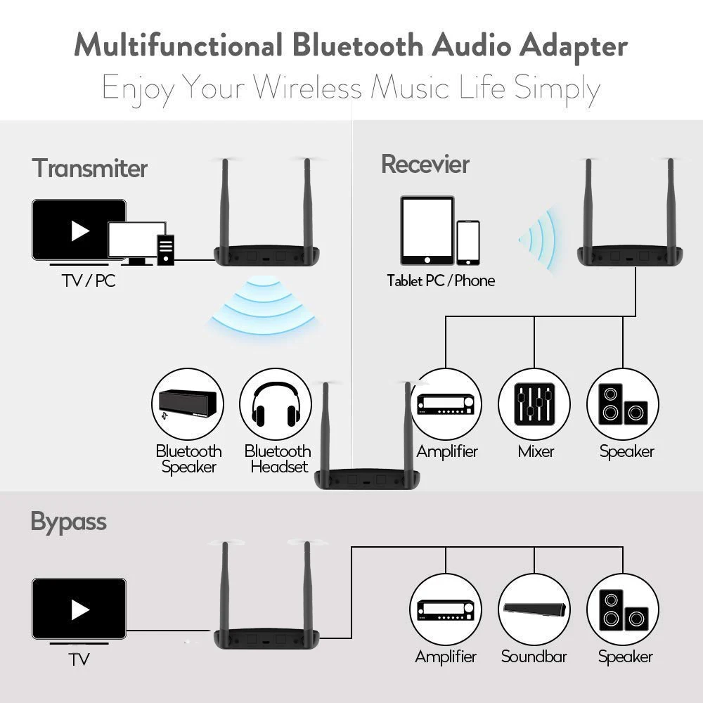 【 3 в 1-режим TX & RX & BYPASS 】Режим TX: Подключите bluetooth-передатчик к аудиоустройствам, таким как TV, iPod или PC, вы можете наслаждаться сверхбыстрым, высококачественным аудио с ваших bluetooth-гарнитур, наушников или динамиков. Режим RX: Сделайте вашу старую домашнюю стереосистему Bluetooth-включите и омолаживайте снова. Режим байпаса (проводной): вам больше не нужно подключать/отключать любые провода, легко Переключить их на другие два режима.